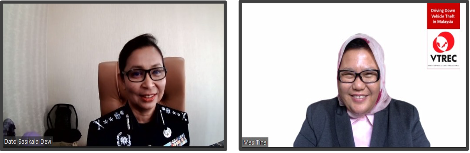 Left: YDH DCP Dato’ Sasikala Devi Subramaniam, Deputy Director of Commercial Crime Investigation Department (CCID) and Puan Mas Tina Abdul Hamid, Co-ordinator of VTREC KUALA LUMPUR, 22 June 2021: Puan Mas Tina Abdul Hamid, Co-ordinator of Vehicle Theft Reduction Council of Malaysia (VTREC) attended a virtual “Meet and Greet” Session…