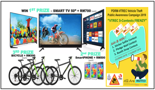 Di samping itu, pelbagai pertandingan telah diadakan bagi menarik minat orang-ramai sepanjang kempen 2-bulan ini yang berlansung di lima (5) buah lokasi kempen yang berasingan dengan matlamat untuk menyebar kesedaran awam kecurian kenderaan ini seluas yang mungkin dan sebanyak mungkin capaian.