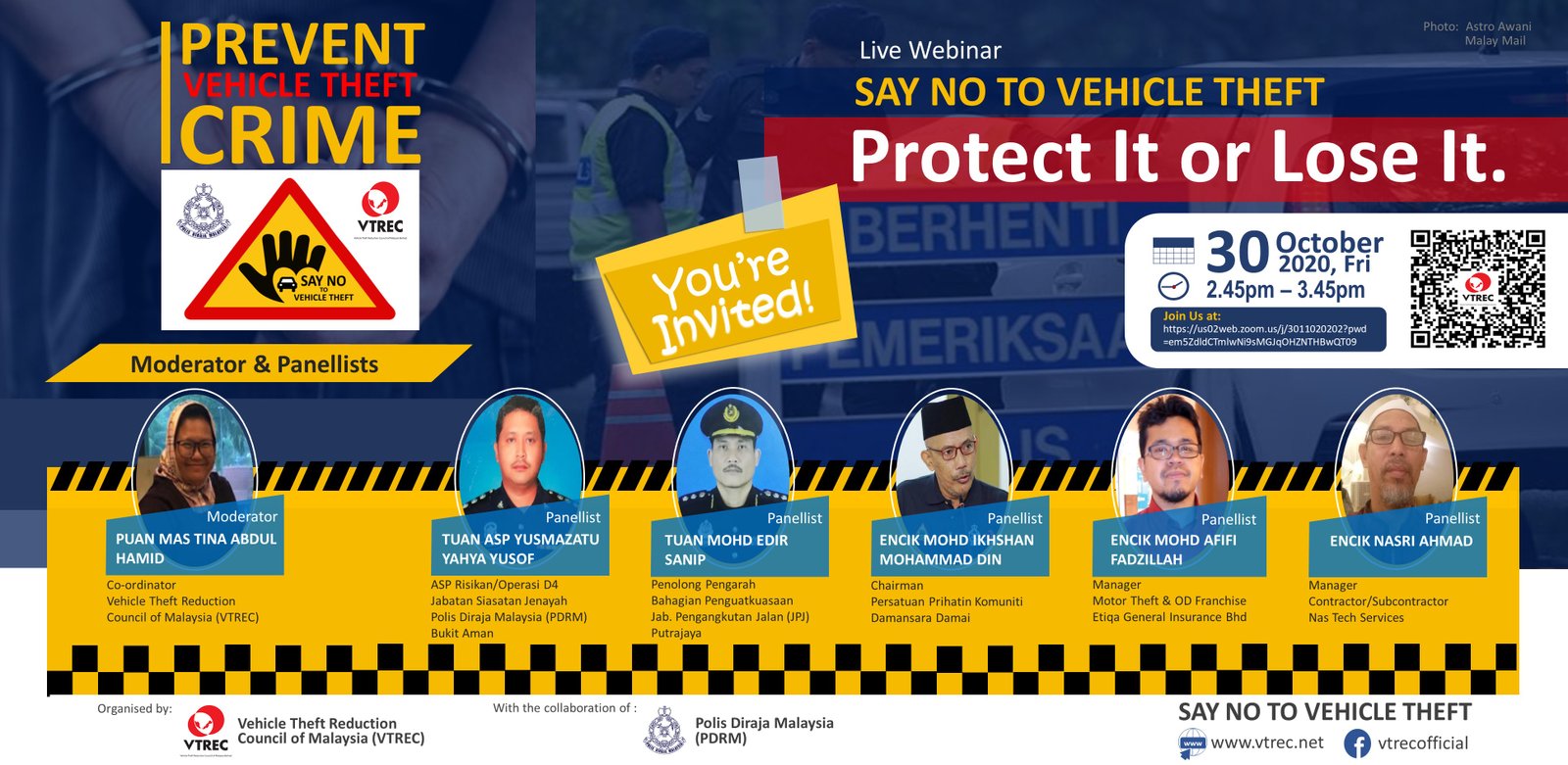 KUALA LUMPUR: The Vehicle Theft Reduction Council of Malaysia (VTREC) with the collaboration of Polis Diraja Malaysia (PDRM) are committed to implement their role to reduce the crime of vehicle theft in Malaysia. Together with other stakeholders a PDRM-VTREC Webinar will be held on Friday, 30 October 2020 at 2.30pm, with the theme “Say No To Vehicle Theft – Protect It or Lose It”.