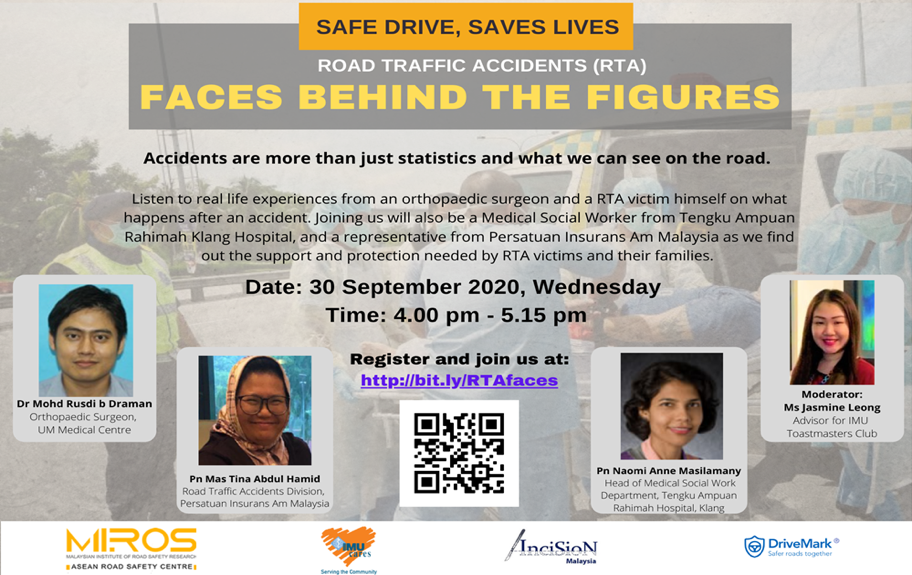 Our panellists will be sharing their personal stories of dealing with cases of road traffic accidents from different perspectives – healthcare, victim, social worker and insurance provider. This is to raise awareness of the long-lasting impact of an accident and it is more than what we can imagine. This is to push for the continuous efforts of the sustainable development goals 3.6 to reduce injuries and deaths caused by road traffic accidents.