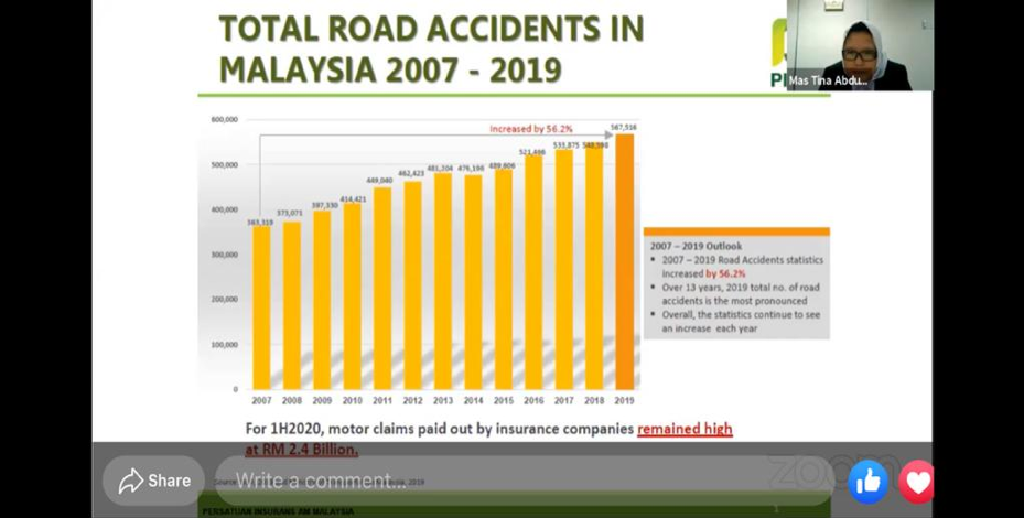 Pn Mas Tina Abdul Hamid in her presentation discussed the total road traffic accidents in Malaysia from the year 2007 until 2019 have increased and total motor claims paid out by insurance industry remained high at RM2.4 Billion for January to June 2020.