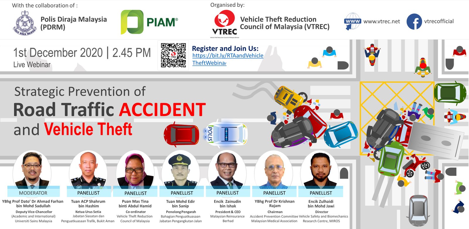 Once vehicles being stolen, then what next? Involvement in a road traffic accident? Really? How? Cloned vehicle? Cut-and-joined vehicle? What is the relationship between vehicle theft and road traffic accident? All these will be answered in a live webinar entitled “Strategic Prevention of Road Traffic Accident and vehicle Theft” organised by Vehicle Theft Reduction Council of Malaysia (VTREC) with the collaboration of Polis Diraja Malaysia (PDRM) and Persatuan Insurans Am Malaysia (PIAM).