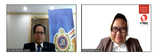 The Co-ordinator of VTREC, Puan Mas Tina took stock of the JPJ-VTREC relations. Both sides welcomed the high degree of engagement and collaboration in regard to curtailing vehicle theft in Malaysia. During the virtual courtesy call Puan Mas Tina briefed on VTREC’s roles, its initiatives and milestones in stimulating the reduction of vehicle theft. The Director-General, YBhg Datuk Zailani took the occasion to thank VTREC for its initiatives and co-operations with JPJ in reducing national rate of vehicle theft. Puan Mas Tina likewise expressed appreciation to JPJ for JPJ’s initiatives and positive collaboration with VTREC. Both sides reaffirmed their commitment to further boosting overall co-operation especially in addressing issues which are related to vehicle theft and that leads to road traffic accidents.