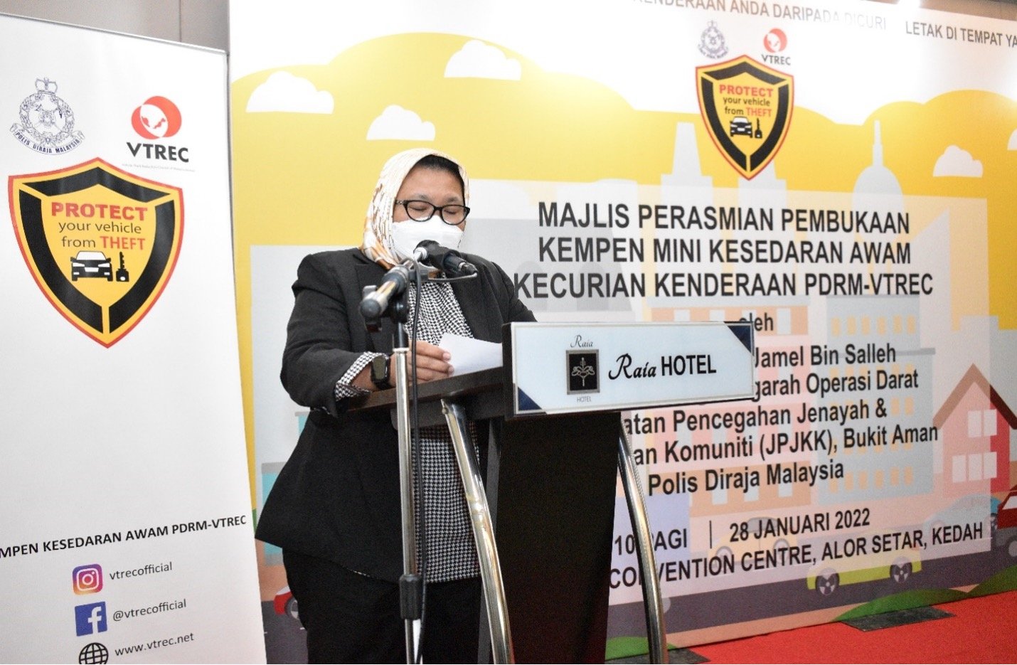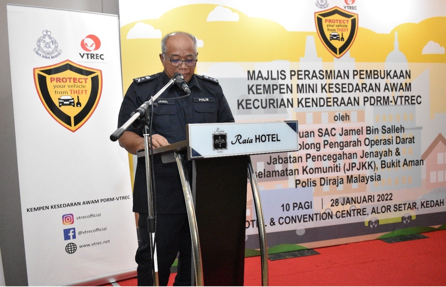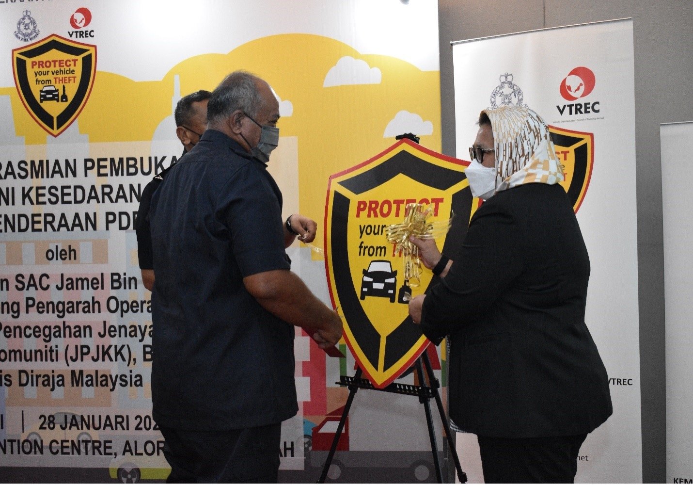 ALOR SETAR, 28 January 2022: The strategic co-operation opportunity between Polis Diraja Malaysia (PDRM) through Jabatan Pencegahan Jenayah dan Keselamatan Komuniti (JPJKK) and Vehicle Reduction Council of Malaysia (VTREC) on vehicle theft mini awareness campaign to further reduce the rate of vehicle theft in the country has been materialised. Vehicle theft awareness rising is a process that seeks to inform and educate the community about vehicle theft with the hope to change motorists’ attitude and behaviour to care and protect their vehicles from being stolen. The event with theme “Protect Your Vehicle from Theft” was held at Raia Hotel and Convention Centre, Alor Setar, Kedah.
