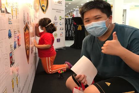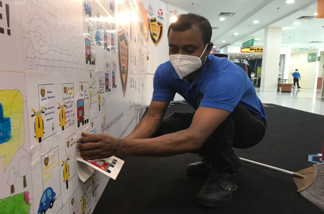 YDH Tuan ASP Razali a/l S. Selvaraju, Jabatan Pencegahan Jenayah dan Keselamatan Komuniti (JPJKK), Bukit Aman (third from left) and YBhg Puan Mas Tina Abdul Hamid, Co-ordinator of VTREC (third from right) at the Doodle Wall of PDRM-VTREC Vehicle Theft Public Awareness Mini Campaign at Giant Hypermarket, Kota Damansara accompanied by police officers from Amanita and JPJKK