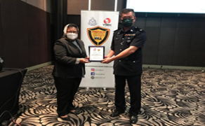 YBhg Puan Mas Tina Abdul Hamid handing over a moment to YDH Tuan DSP Abd Rahman bin Abd Ghani, Ketua Bahagian Pencegahan Jenayah dan Keselamatan Komuniti, Polis Diraja Malaysia (PDRM), IPD Johor Baharu Selatan, Johor.