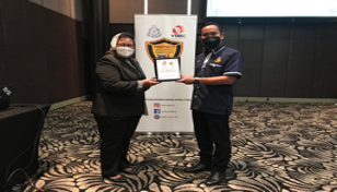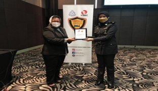 YBhg Puan Mas Tina Abdul Hamid handing over a moment to YBrs Tuan Mohamad Firdaus Mohd Ibrahim, Penolong Pengarah Penguatkuasa, Jabatan Pengangkutan Jalan Malaysia (JPJ), Negeri Johor
