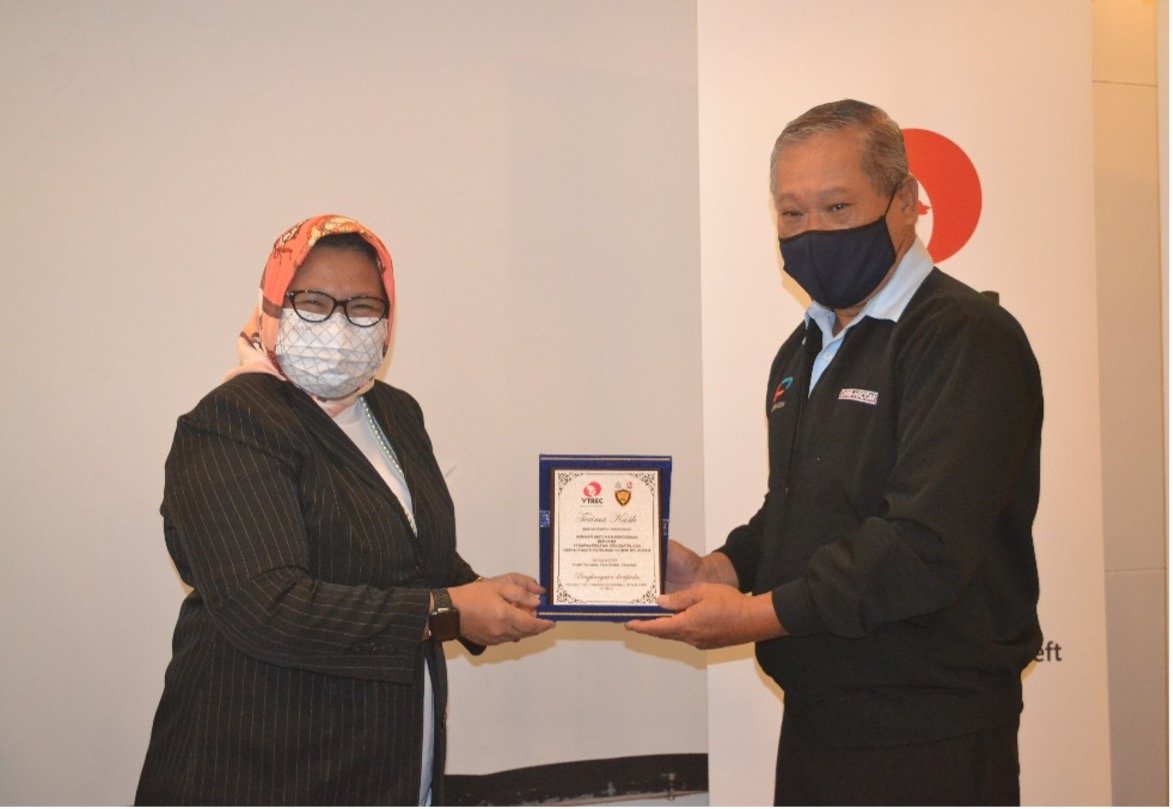 YBrs Puan Mas Tina Abdul Hamid, Co-ordinator of VTREC delivering mementos to YBhg Dato’ Ooi Win Juat, Head of Marketing & Advisory, PUSPAKOM Sdn Bhd