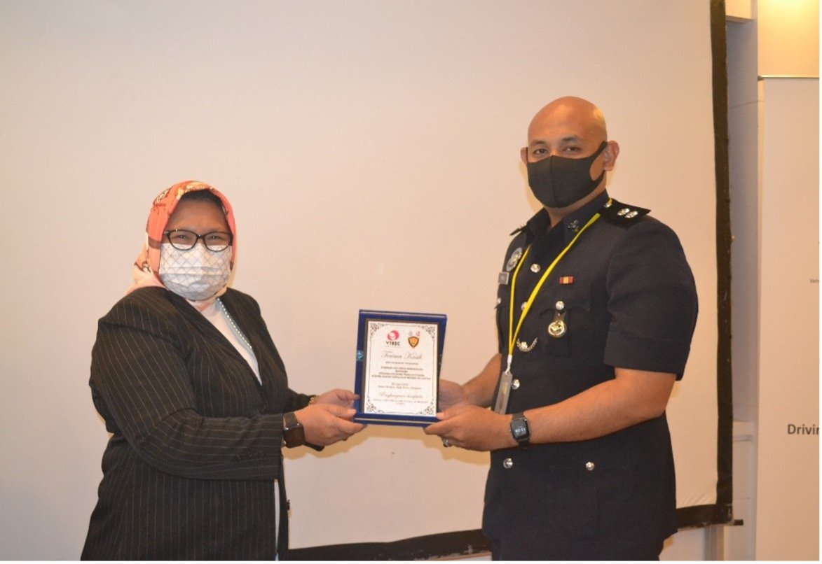 YBrs Puan Mas Tina Abdul Hamid, Co-ordinator of VTREC delivering mementos to YBrs Tuan Mohd Azizi Noor Azmin, Senior Officer, Enforcement Division of Road Transport Department (JPJ)