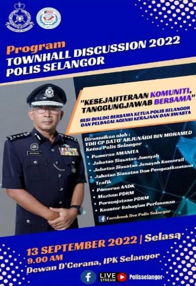 The Townhall Discussion 2022 was organized by Jabatan Pencegahan Jenayah dan Keselamatan Komuniti (JPJKK) of IPK Selangor of which officiated by YDH CP Dato’ Arjunaidi bin Mohamed, Selangor Police Chief. The purpose of the discussion was to hold joint meetings and two-way communication between police, government agencies, non-government, and the community on common issues that are comprehensive including the crime of vehicle theft, stolen vehicles for spare parts, community well-being and to seek comprehensive solutions to overcome the issues.