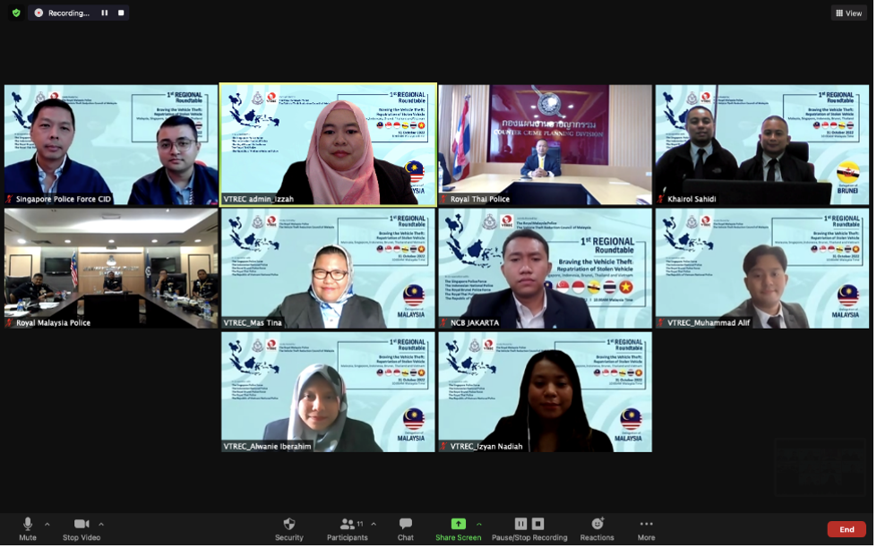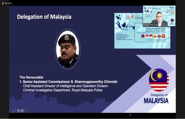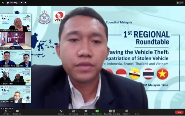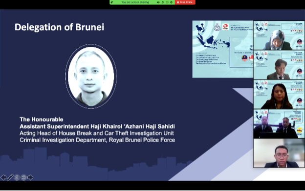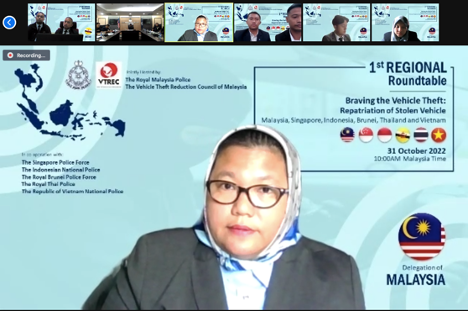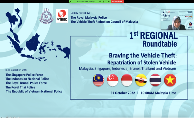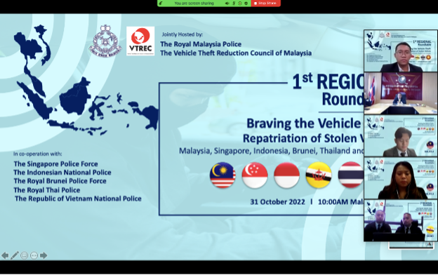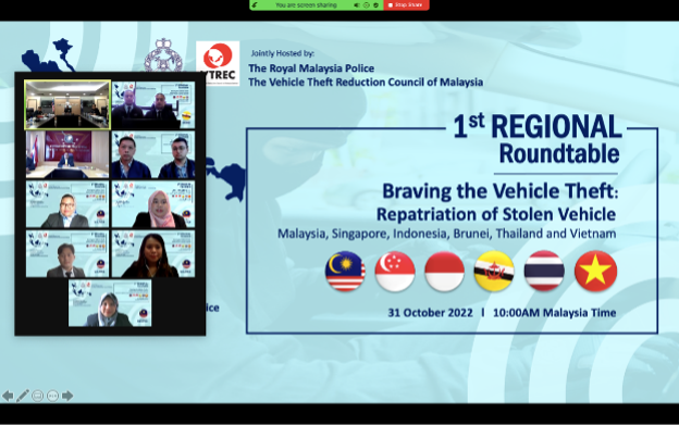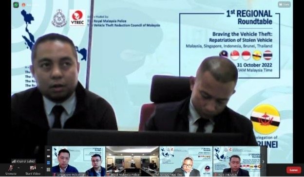 The roundtable convenes senior officials representing police of five regional countries including Malaysia, Singapore, Indonesia, Brunei, and Thailand to discuss issues at the fore of recent vehicle theft in the region. The roundtable took place virtually to tackle issues relating to vehicle theft and repatriating stolen vehicles between the regional countries.