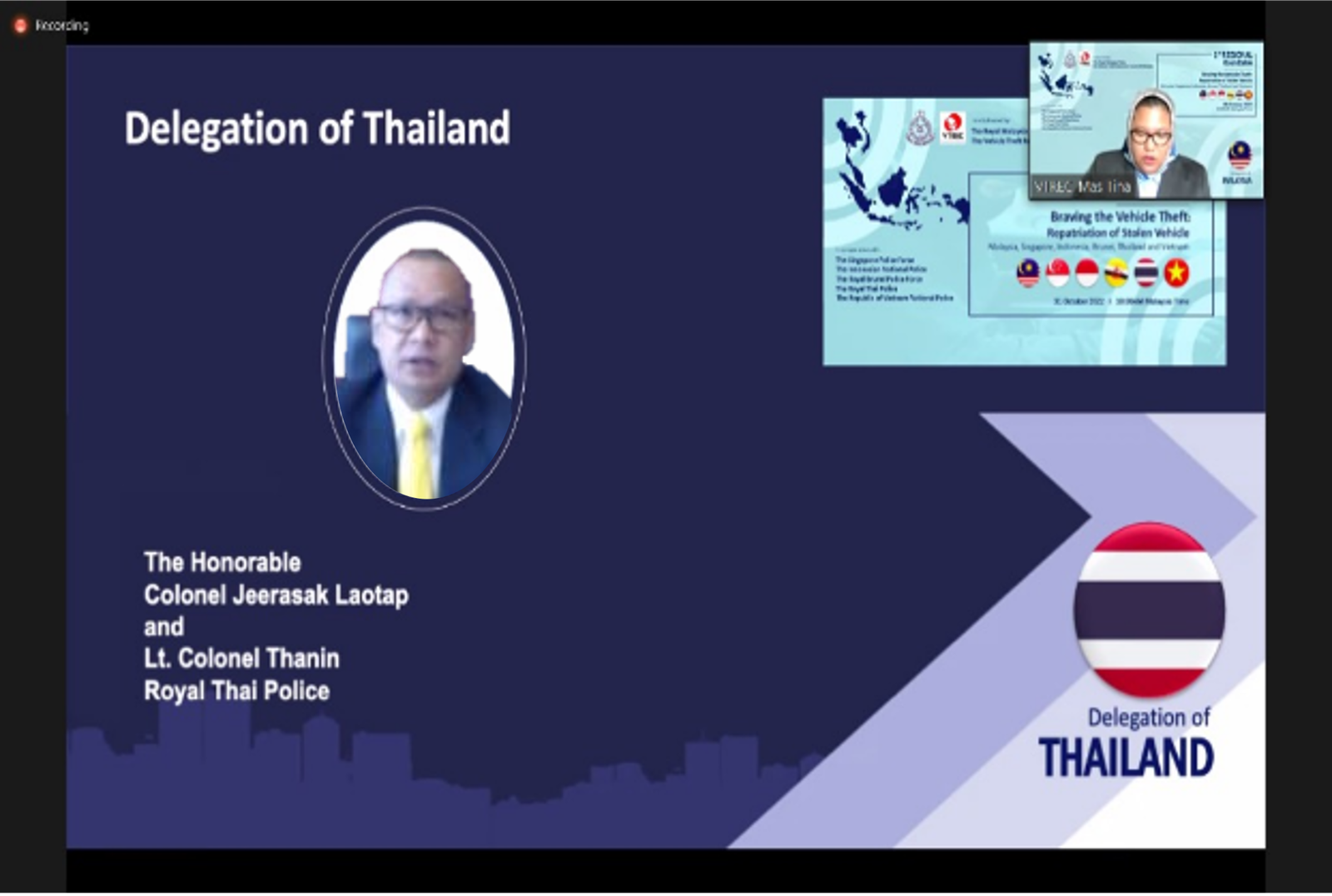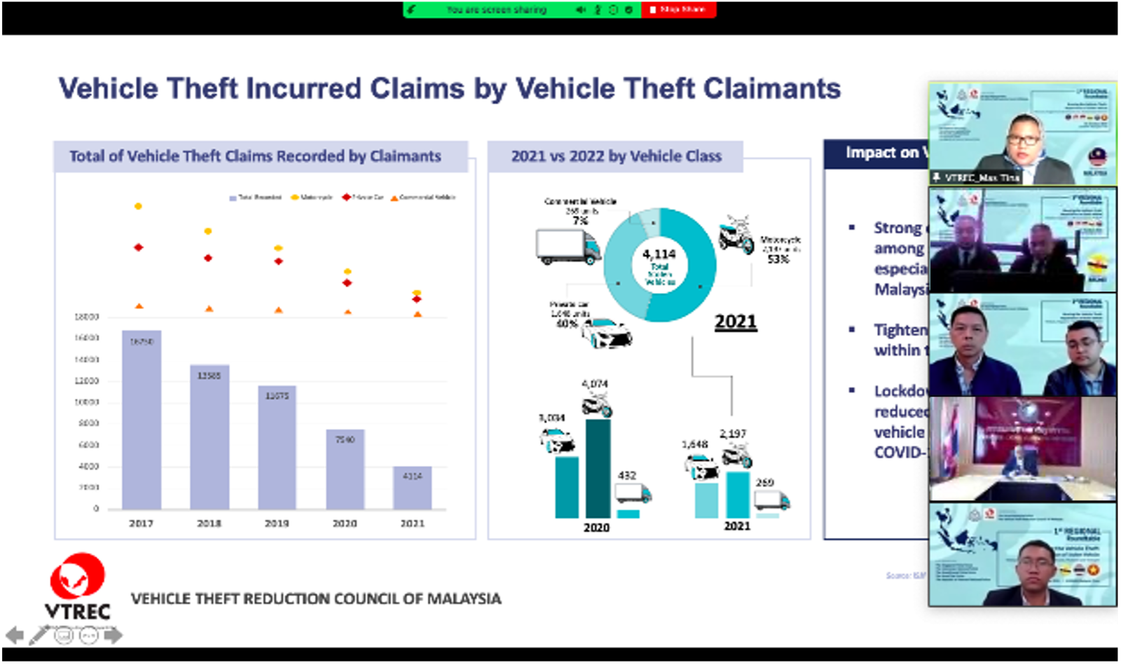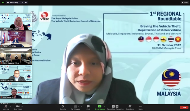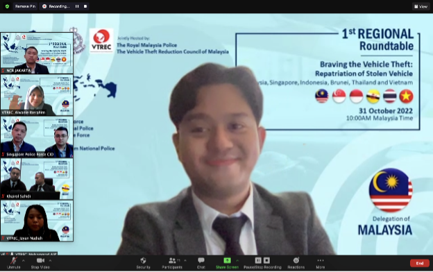 He concluded his speech by emphasising that collaboration among the regional countries in the roundtable is key. One of the ways to win against organised vehicle theft crime is solidarity between enforcement agencies and the stakeholders by sharing of respective information, technology and best practice sharing. He also thanked Vehicle Theft Reduction Council of Malaysia for taking the lead to organise the roundtable which came just in time and he also thanked all delegates for participating and look forward to see everyone again physically in Kuala Lumpur for our following Regional Roundtable Discussion on vehicle theft.