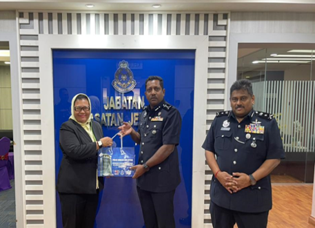 YDH DCP Dato’ Hussein Omar Khan warmly welcomed the entourage. Also present during the courtesy call were YDH Tuan SAC S. Shanmugamoorthy Chinniah, Principle Assistant Director of JSJ, YDH ACP Tuan Roslan Tahir of JSJ, YDH ASP Tuan Yusmazatu Yahaya Yusof, Ops Lejang, JSJ and Executive Officers of VTREC, Puan Nur Alwanie Iberahim and Puan Izyan Nadiah Mat Din.