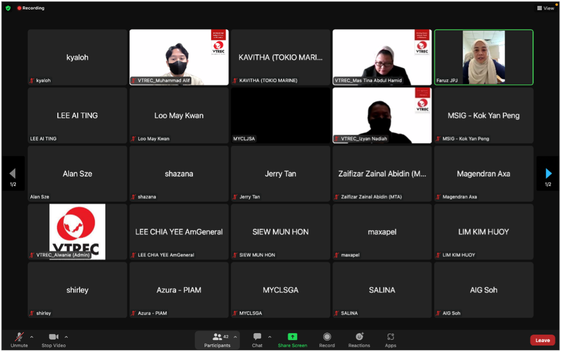 KUALA LUMPUR, 14 December 2022 – Under the initiative of information sharing and to enlighten knowledge pertaining to vehicle registration card of a total loss declared vehicle for disposal, Vehicle Theft Reduction Council of Malaysia (VTREC) has steered a special virtual briefing session for general insurance companies and takaful operators today. The session was organised in the co-operation of Jabatan Pengangkutan Jalan Malaysia (JPJ), Insurance Services Malaysia Berhad (ISM), Persatuan Insurans Am Malaysia (PIAM) and Malaysian Takaful Association (MTA). The co-ordinator of VTREC, Puan Mas Tina Abdul Hamid has took up the helm to moderate the session.