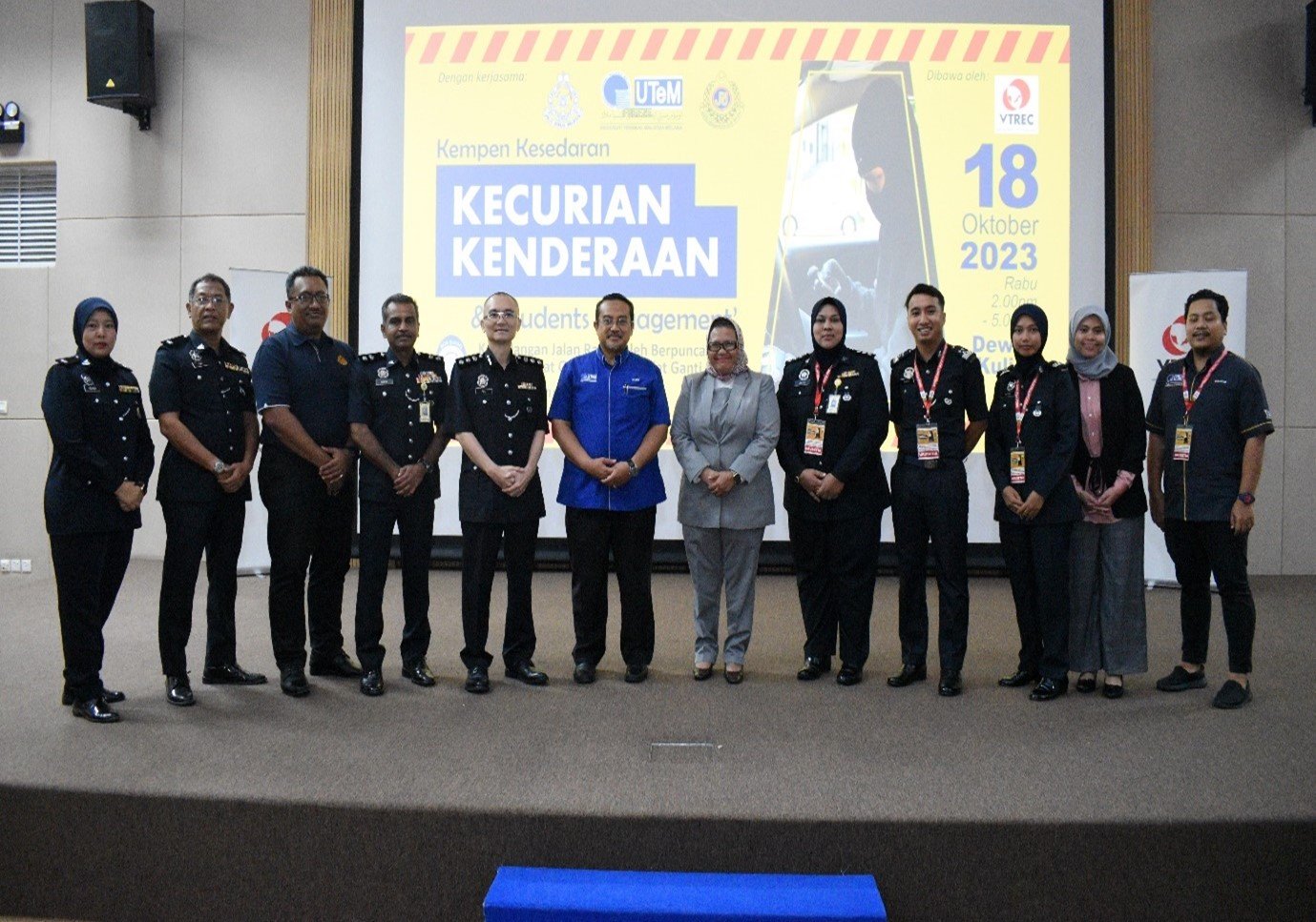 From right: YDH Puan DSP Norazlinda Nordin, Pegawai Turus Kepolisian Komuniti IPK Melaka, YDH DSP Nik Halim Nik Mat, Pegawai Turus Koordinasi Sumber Sokongan IPK Melaka, YBrs Tuan Nor Hishammudin Mohamad Zin, Ketua Bahagian Keselamatan Jalan Raya Negeri Melaka, YDH Tuan Supt Sidambaram A/L Arunasalam, Timbalan Ketua Jabatan Pencegahan Jenayah dan Keselamatan Komuniti, YDH Tuan ACP Foo Chek Seng, Ketua Jabatan Pencegahan Jenayah dan Keselamatan Komuniti, YBhg KS Professor Madya Datuk Dr. Sabri Mohamad Syarif, Timbalan Naib Canselor Hal Ehwal Pelajar & Alumni, YBrs Puan Mas Tina Abdul Hamid, Ko-ordinator Vehicle Theft Reduction Council of Malaysia, YDH Puan ASP Juliya Yusof, Pegawai Penyelaras Kor SUKSIS, Saudara KS Muhammad Aidil Fadzly Saidina Omar, Presiden Kor SUKSIS UTeM, Saudari KS Nur Hafizah Alwi, Urusetia Kor Sukarelawan Siswa Siswi.