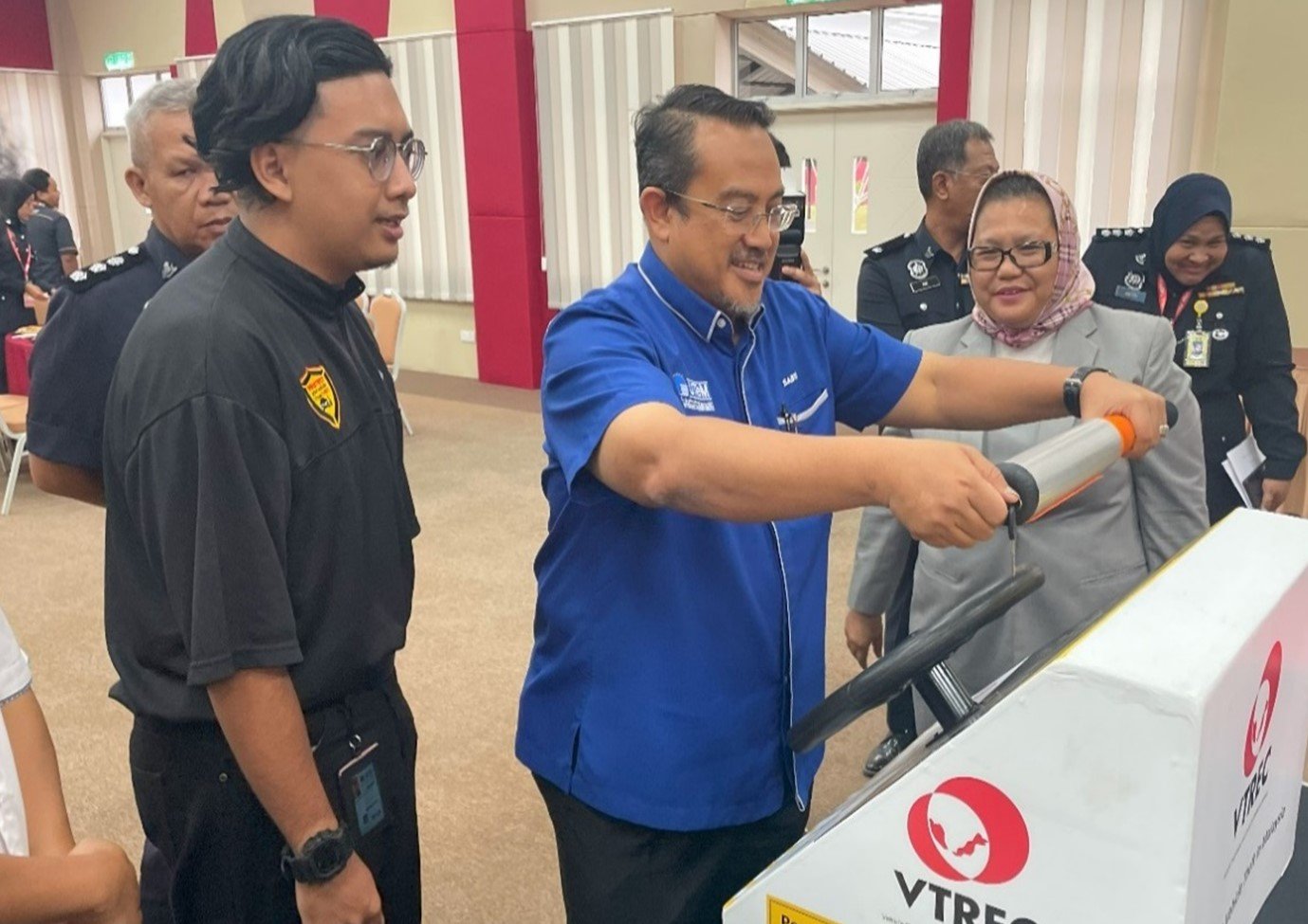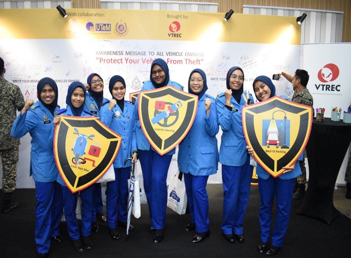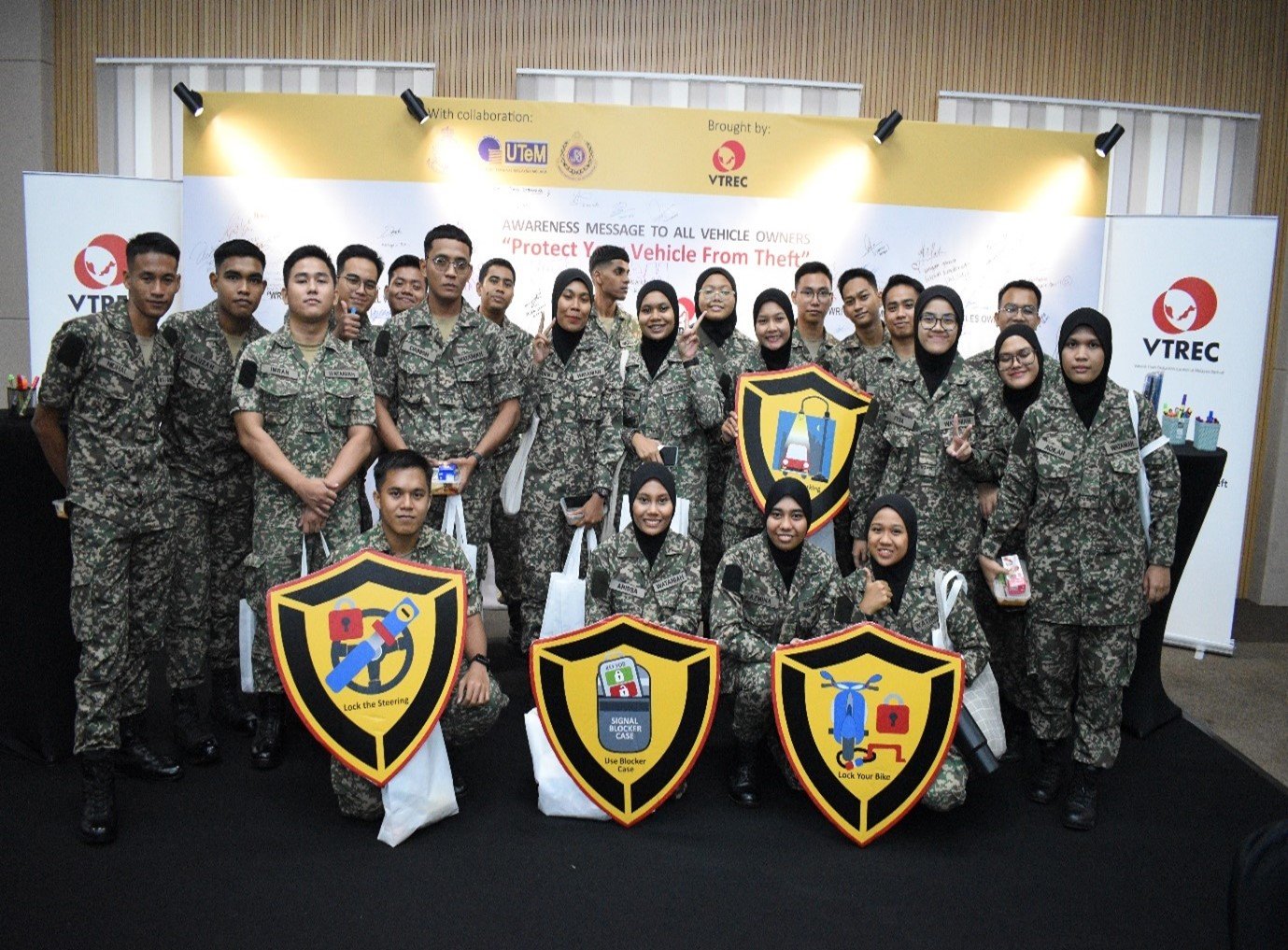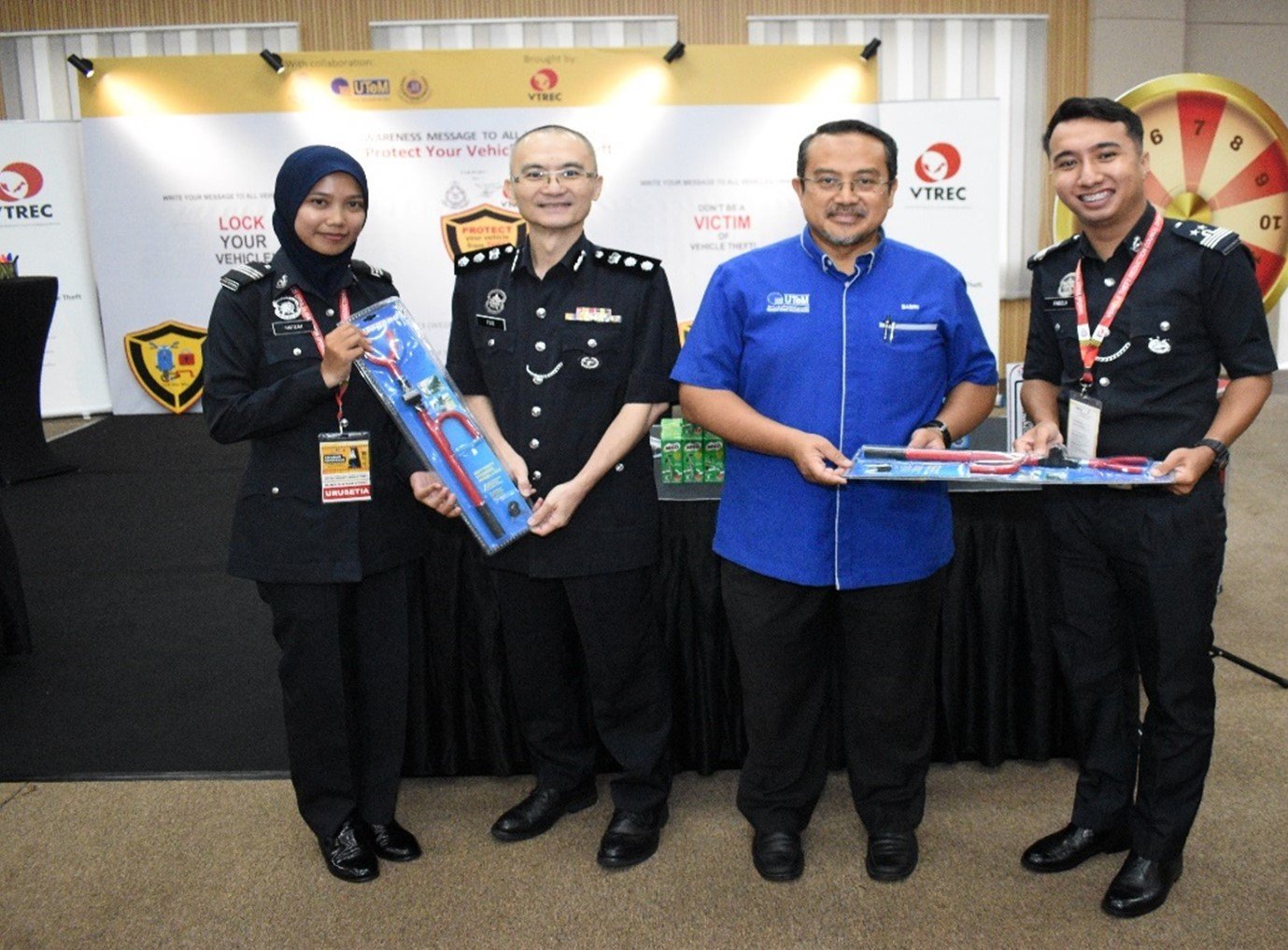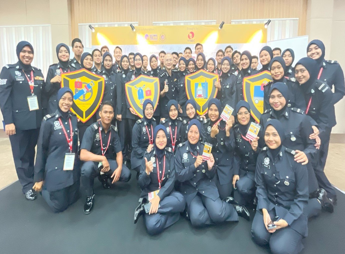 It was a clear demonstration of VTREC’s commitments to fostering knowledge sharing and best practice sharing with the students of higher learning institution in the persuit of reducing vehicle theft among varsity communities in collaboration with UTeM Students Affairs Department (HEPA) and Jabatan Pencegahan Jenayah dan Keselamatan Komuniti, Polis Diraja Malaysia (JPJKK) Negeri Melaka led by YDH ACP Foo Chek Seng , Ketua Jabatan Pencegahan dan Keselamatan Komuniti Negeri Melaka, Pasukan Badan Beruniform UTeM especially Kor SUKSIS UTeM led by Puan ASP Juliya Yusof which assisted by Saudara Muhammad Aidil Fadzly Saidina Omar, Presiden Sukarelawan Polis Siswa Siswi (SUKSIS) and Saudari Nur Hafizah Alwi, Urusetia Sukarelawan Polis Siswa Siswi (SUKSIS).