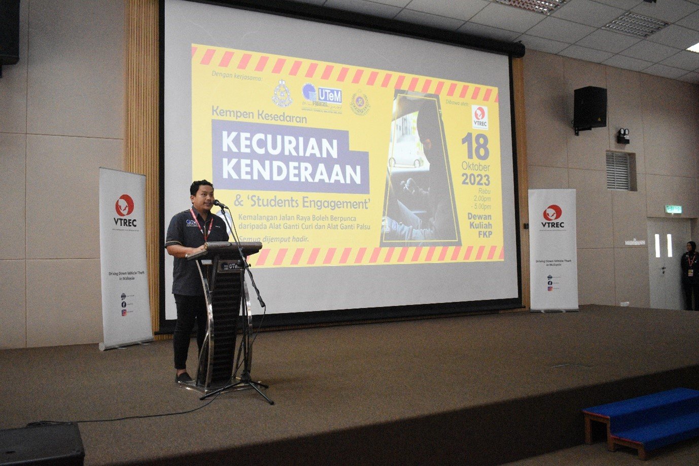 MELAKA, 18 Oktober 2023: The Vehicle Theft Reduction Council of Malaysia (VTREC) holds a strategic “Kempen Kesedaran Kecurian Kenderaan & Students Engagement” that causes road traffic accidents due to vehicles stolen parts as well as consequences of fake spare parts with the co-operation of Universiti Teknikal Malaysia Melaka (UTeM) and Kor Sukarelawan Polis Siswa Siswi (Kor SUKSIS UTeM). The event has taken place at Dewan Fakulti Pembuatan, UTeM, Ayer Keroh, Melaka.