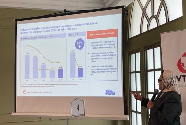 YBrs Puan Mas Tina Abdul Hamid, Co-ordinator of VTREC, share some statistics on status of vehicle theft. She explained that throughout the years based on insurance industry statistics, there had been a significant decrease in overall of country-level vehicle theft record from 2013 to 2022 as much as 89%. Meanwhile, comparing 2022 with 2021, overall 2021 has recorded 4,114 stolen vehicles, it has decreased to 4,103 units in 2022, which is a decrease of 0.3%. In the context of vehicle theft by vehicle model, it shows a decrease of 1.2% for Motorcycles and a decrease of 10.8% for Commercial Vehicles. However, Private Vehicle has recorded a slight increase of 0.5%. The overall decrease for the ten-year timeline in vehicle theft statistics illustratedthat initiatives taken and deployed by VTREC and the stakeholders have had a huge impact on the decline of vehicle theft record.