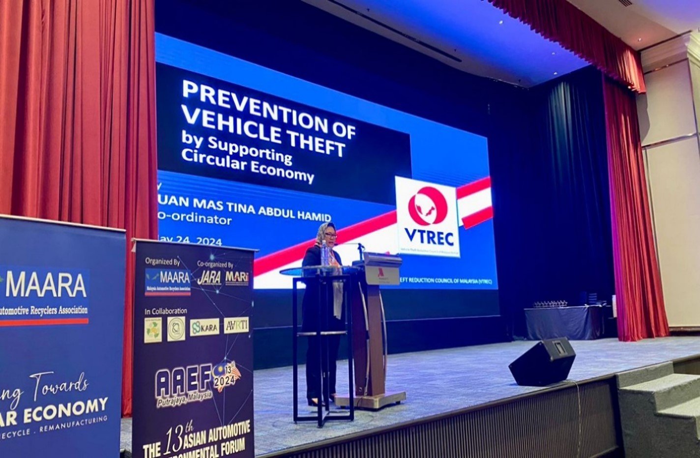 YBrs Puan Mas Tina Abdul Hamid, Co-ordinator of Vehicle Theft Reduction Council of Malaysia (VTREC) delivering her Keynote at the 13th Asian Automotive Environmental Forum (AAEF) 2024 – Moving Towards Circular Economy in conjunction with Malaysia Auto Show 2024 (the biggest Auto Show in Malaysia), presented the significant reduction in vehicle theft rate in Malaysia.