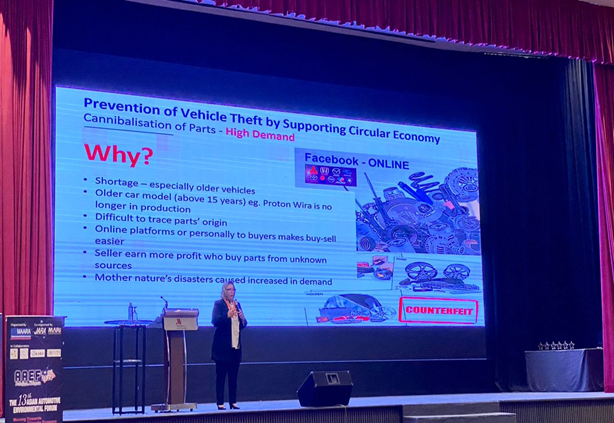YBrs Puan Mas Tina Abdul Hamid, Co-ordinator of Vehicle Theft Reduction Council of Malaysia (VTREC) was invited to be the Keynote Speaker to address the need to support the circular economy in preventing vehicle theft in particular the reuse and recycle of used vehicle spare parts. In her speech she touches on diverging from the traditional linear model which characterised by a take, make and dispose process to sustainable process. The highlights of her speech was the important of establishment of a more sustainable vehicle parts to keep materials in use for as long as possible and products at the highest utility and value, to minimise waste and promote a sustainable use of used parts from unused vehicles including motorcycles, private cars and commercial vehicles, while addressing the environmental impact.