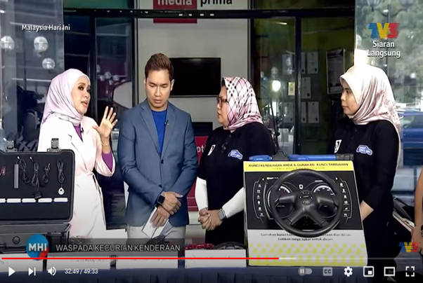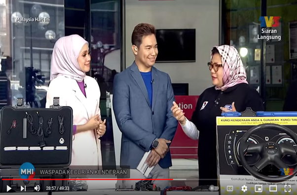 There were demo sets being displayed which let viewers have a closer glance to understand the anti-theft devices among others Immobilizer, GPS, OBD, relay, mechanical locks such as steering lock, for motorcycle such as chains, pad lock, gear lock, break disk lock as well as hand break lock. The reputable TV3 program was hosted by non-other than Puan Hazreena Kassim and Encik Fadzly Fuad.