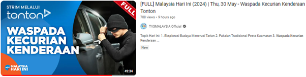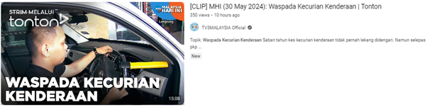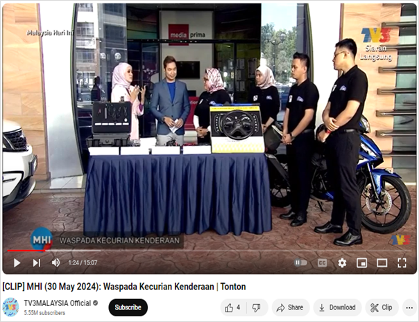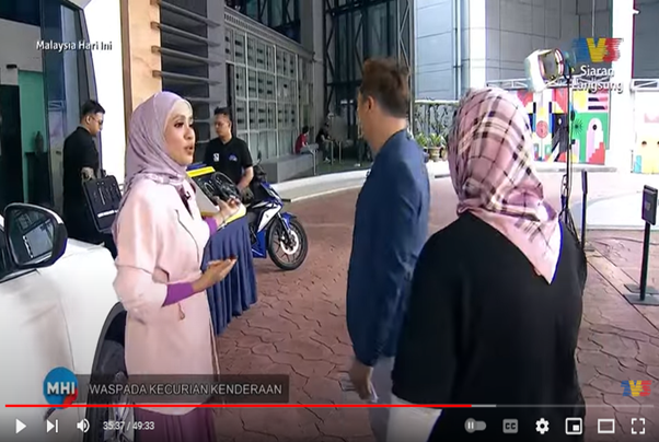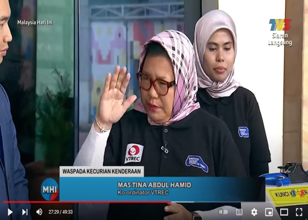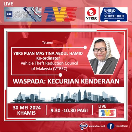 Petaling Jaya, 30 May 2024: With over than 38,322 vehicles have had been stolen in 2013 then reduced to 4,086 thefts in 2023, of which reduced by 89% according to insurance industry statistics, the Vehicle Theft Reduction Council of Malaysia (VTREC) was invited by TV3 MHI to Sri Pentas to talk about “WASPADA KECURIAN KENDERAAN’” or beware of vehicle theft. The session ultimate objective is to raising awareness and educating the public the need of crime prevention among the motorists.