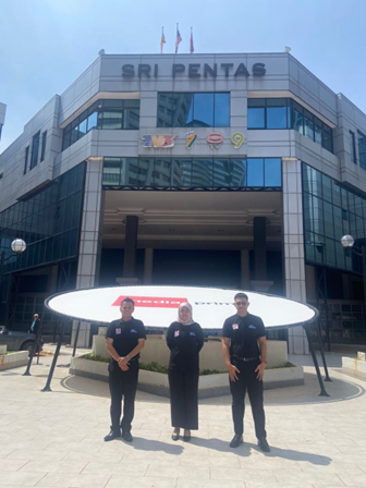 Left: Encik Farid Akmal Johan, Encik Aniq Denial dan Puan Marlyana Mansur, Executive of VTREC in front of Sri Pentas, TV3