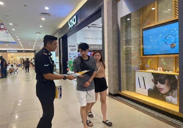 L/KPL Muhammad Azri Mohammad distributing campaign material to the public as part of the awareness campaign on vehicle theft