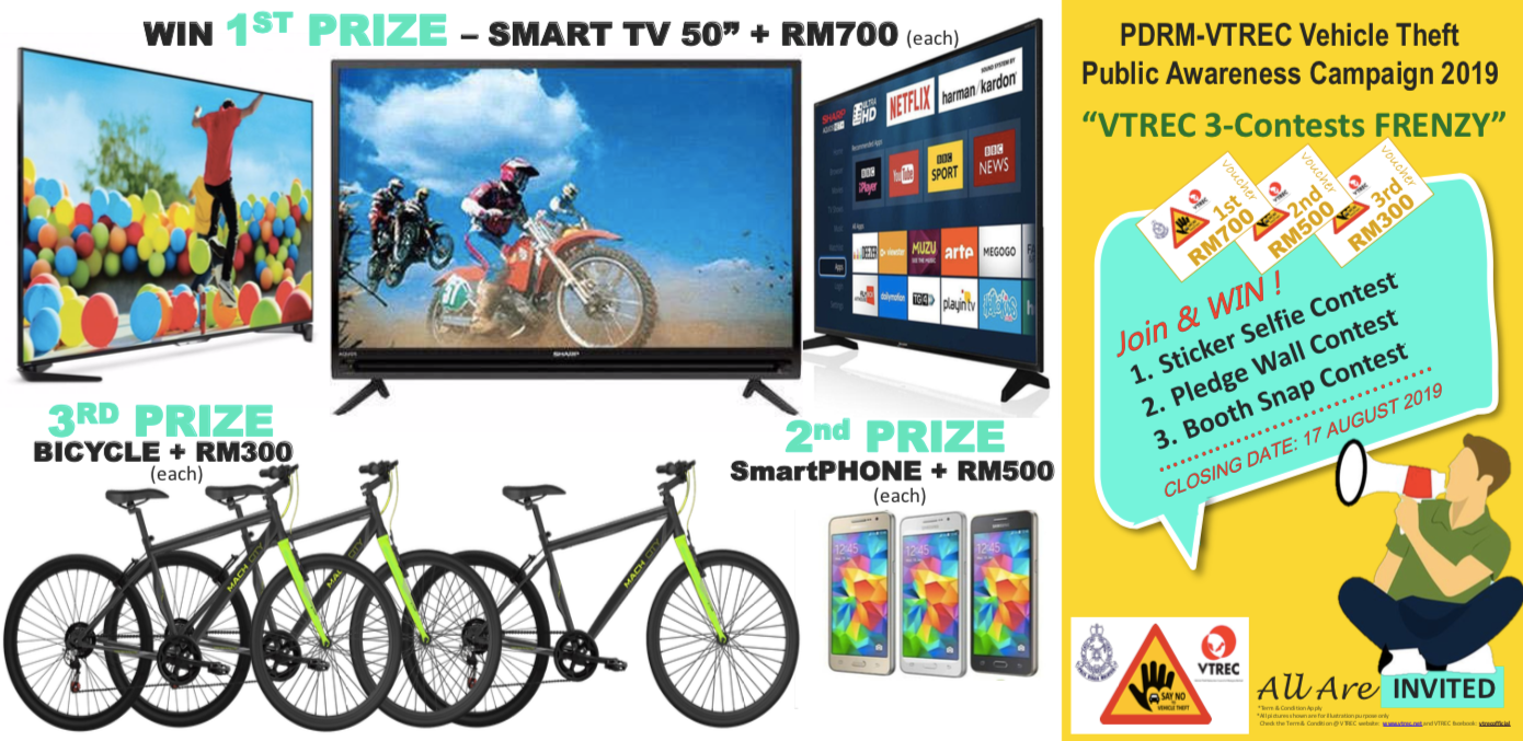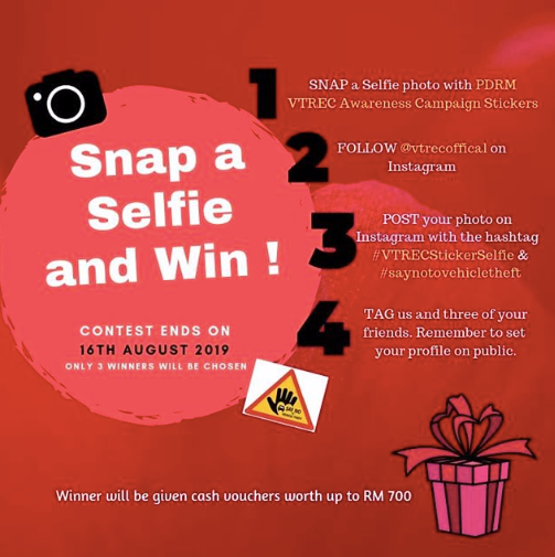 Snap Your Best Sticker Selfie & Win contest (“#VTRECStickerSelfie Contest”) isorganized by Vehicle Theft Reduction Council of Malaysia Berhad (771609-T), hereby known as the “Organizer” or “VTREC”. This contest consists of one (1) round for a continuous period, from 17th June 2019, Monday 10.00am to 17th August 2019, Friday, 11:59pm (“the Contest Period”)or any period as notified by the Organizer on VTREC Instagram and Facebook. The Organizer may, at its sole and absolute discretion extend or shorten the Contest Period at any time without any prior notice to any party (the “Extended or Shorten Period“).
