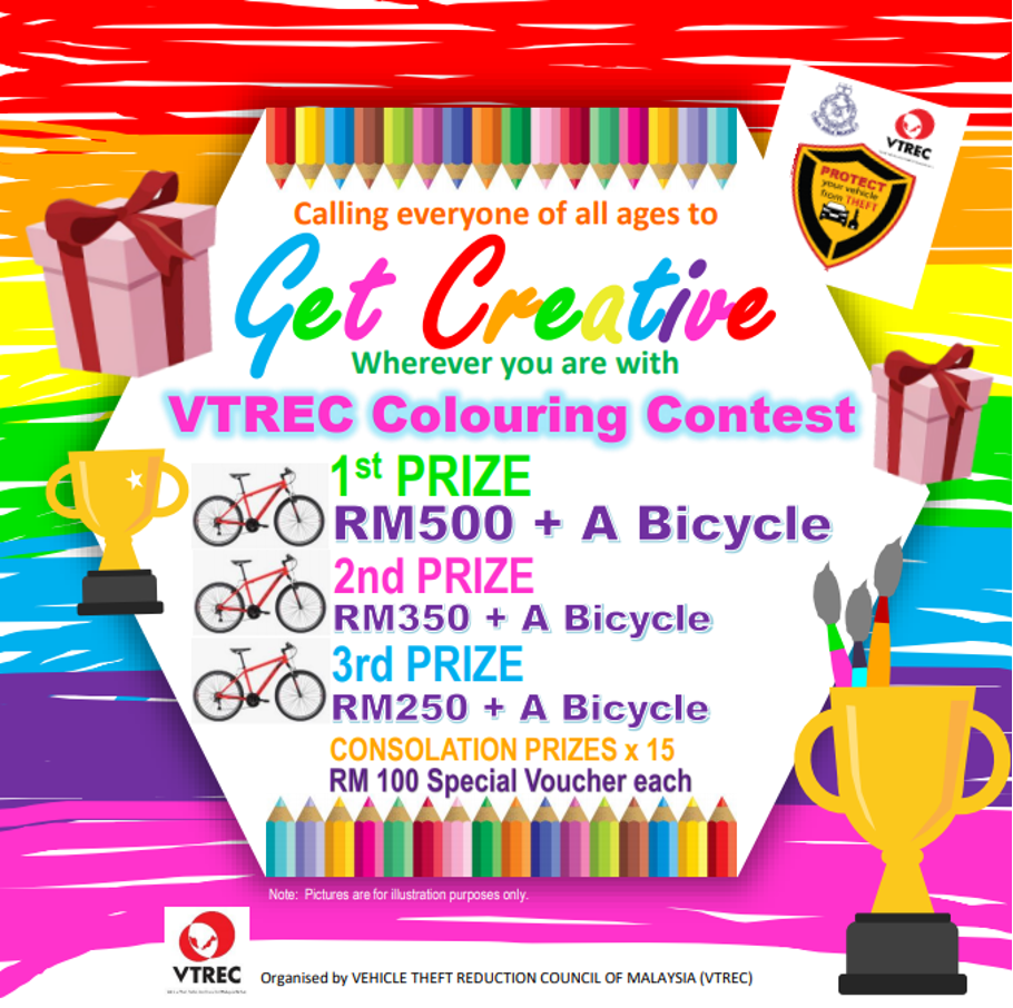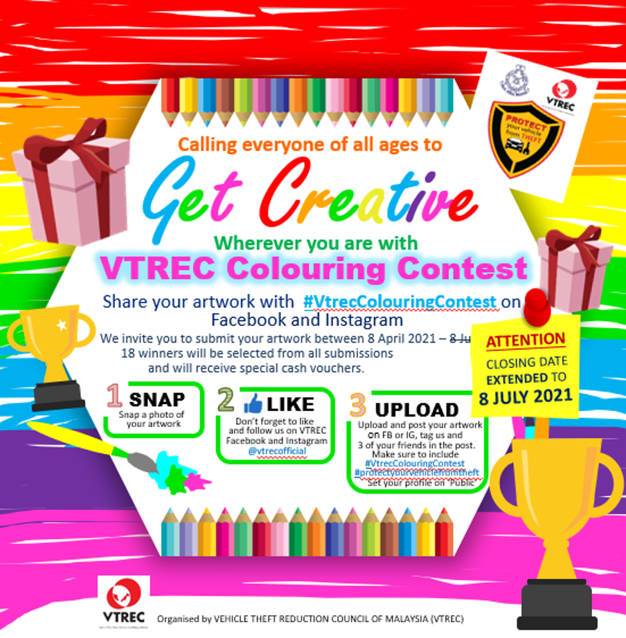 VTREC Colouring Contest (“#VTRECColouringContest”) is organized by Vehicle Theft Reduction Council of Malaysia Berhad (771609-T), hereby known as the “Organizer” or “VTREC”. This contest consists of one (1) round for a continuous period, from 8 April 2021, Thursday, 10.00am to 8 June 2021, Tuesday 8 July 2021 Thursday, 11:59pm (“the Contest Period”) or any period as notified by the Organizer on VTREC Instagram and Facebook. The Organizer may, at its sole and absolute discretion extend or shorten the Contest Period at any time without any prior notice to any party (the “Extended or Shorten Period“).