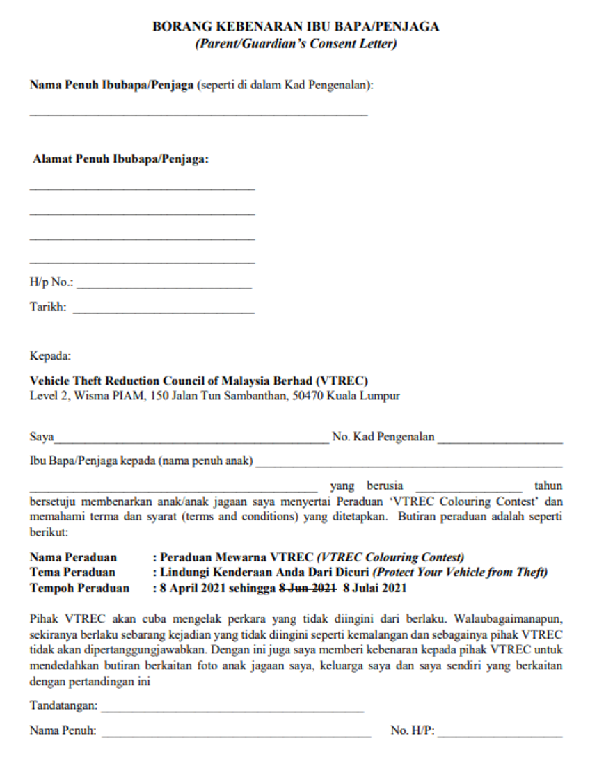 - Contestant under 18 years old, ‘Surat Kebenaran Ibu Bapa/Penjaga’ (Parent’s Consent Letter) with signature must be provided. Parent’s or legal guardian’s name, Identity Card number, child’s name, child’s age and mobile number must be clearly stated and to be emailed to Encik Muhammad Alif at alif.vtrec@gmail.com together with the child’s complete artwork. All entries must be accompanied with ‘Surat Kebenaran Ibu Bapa/Penjaga’ (Parent/Guardian’s Consent Letter) and signed by a parent or legal guardian, which hereby gives his/her consent to and authorised VTREC to disclose their particulars or photos for the purpose of this Contest and shall be deemed to be the consent for the purposes of the Personal Data Protection Act 2010.