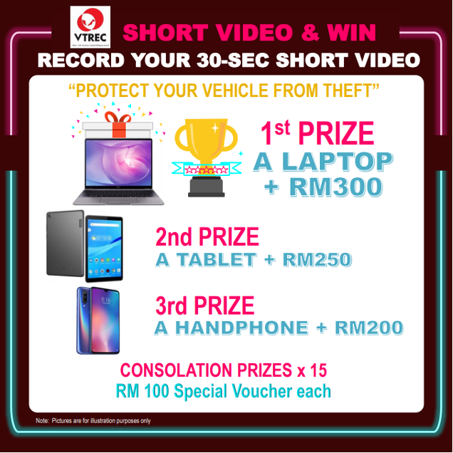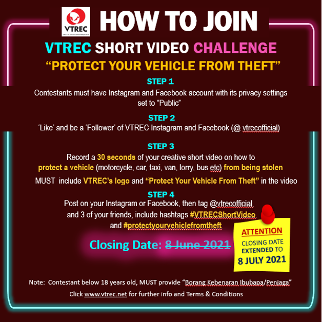 - For submission, contestant must post the short video on their Instagram and Facebook @vtrecofficial, then tag 3 of your friends, and write hashtags #VTRECShortVideo and #protectyourvehiclefromtheft.