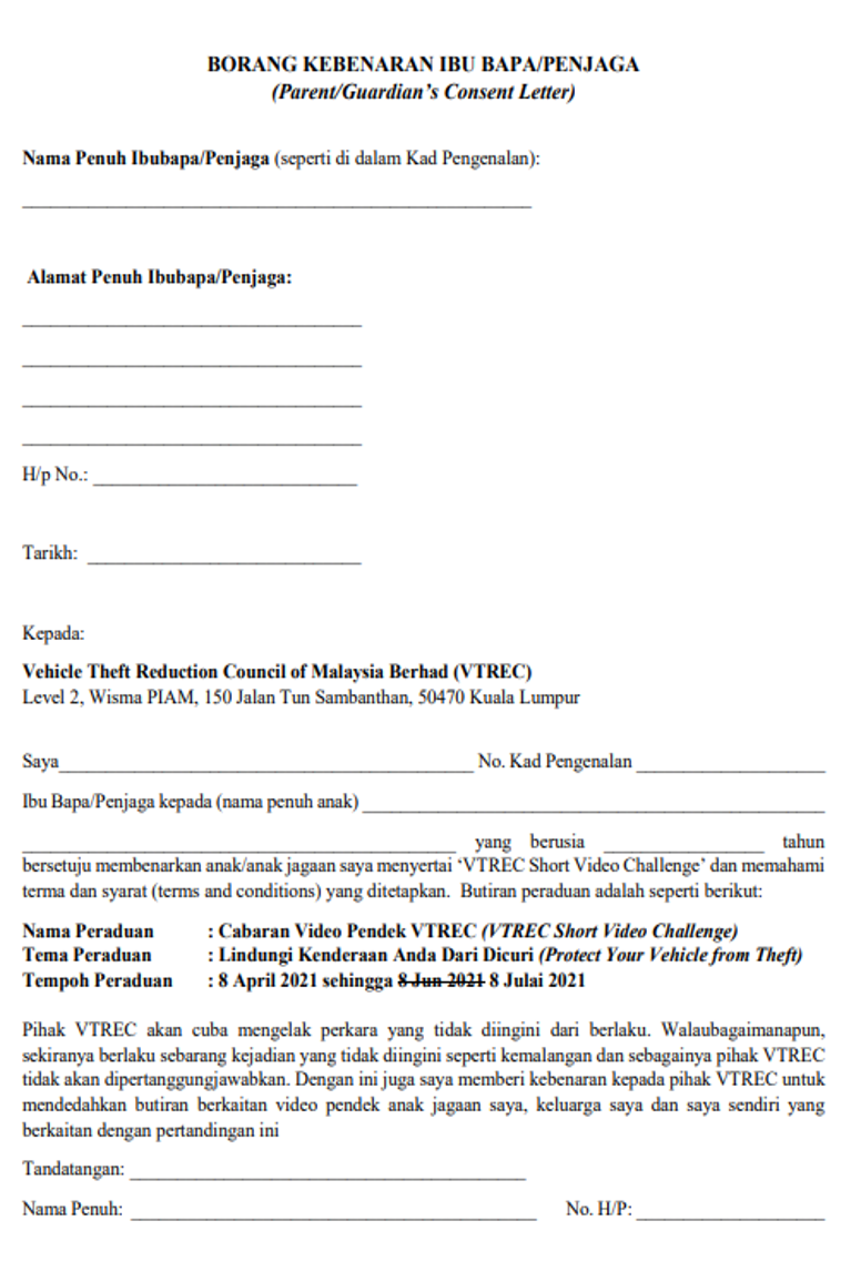 VTREC Short Video Challenge (“#VTRECShortVideo”) is a contest organized by Vehicle Theft Reduction Council of Malaysia Berhad (771609-T), hereby known as the “Organizer” or “VTREC”. The Organizer may, at its sole and absolute discretion extend or shorten the Contest Period at any time without any prior notice to any party (the “Extended or Shorten Period“).