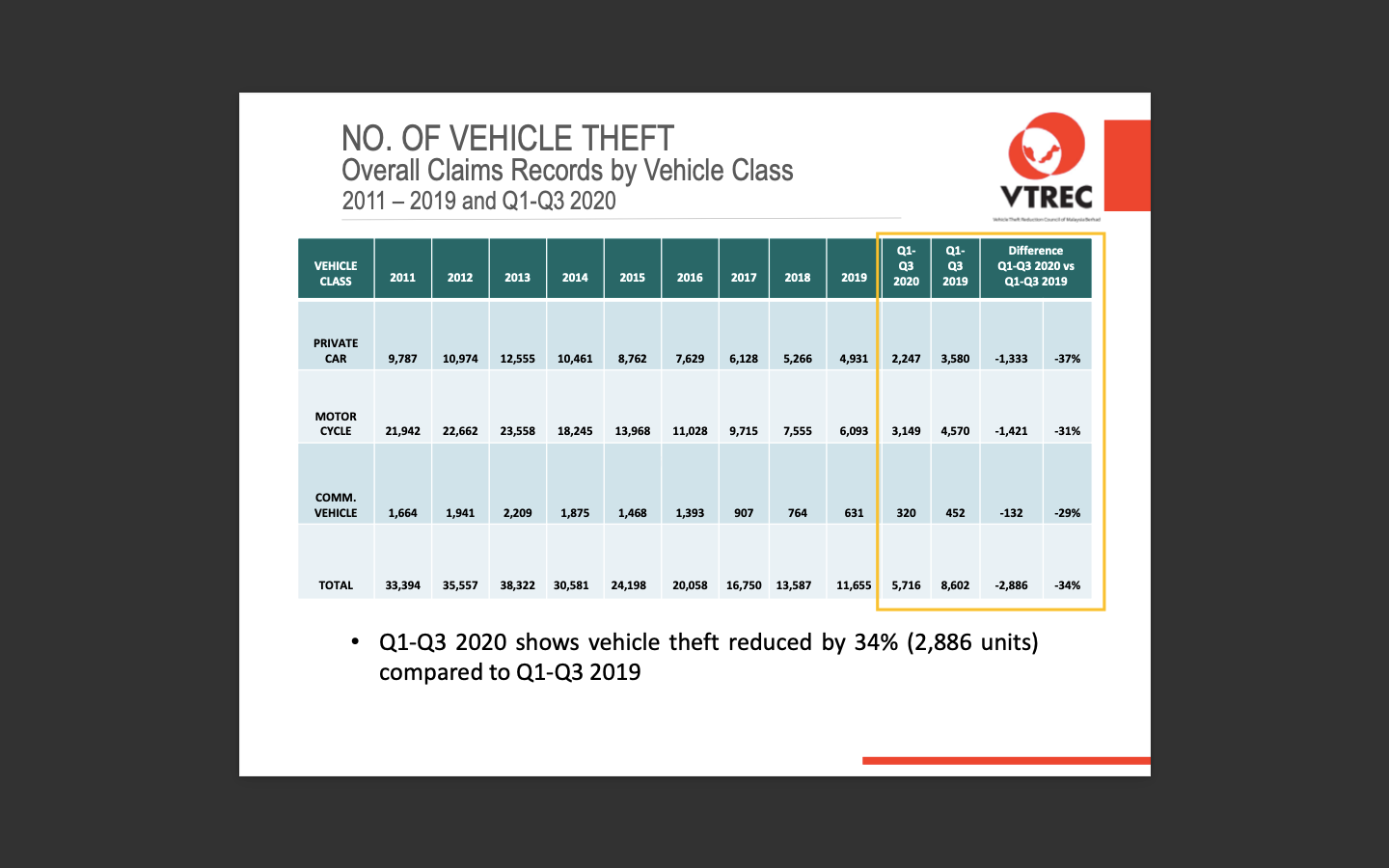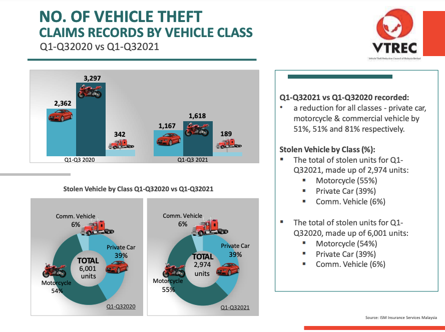 NO. OF VEHICLE THEFT CLAIMS RECORD BY VEHICLE CLASS Q1-Q3 VS Q1-Q32021