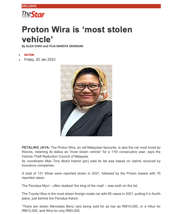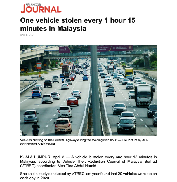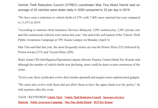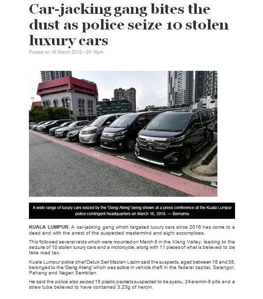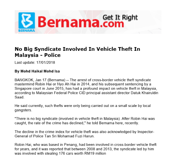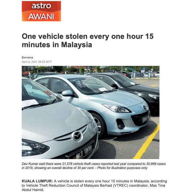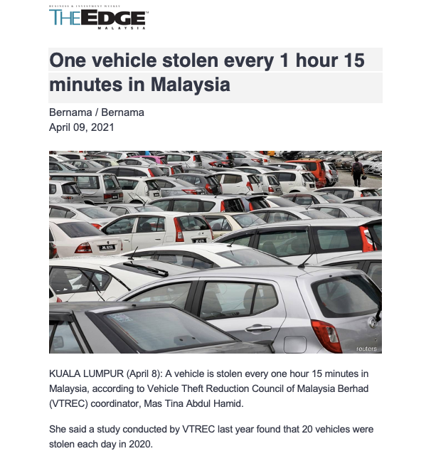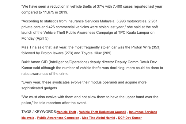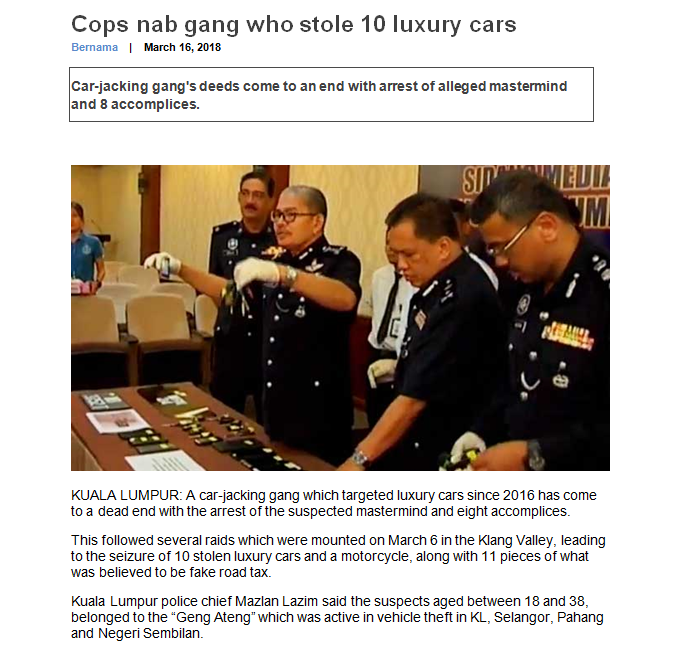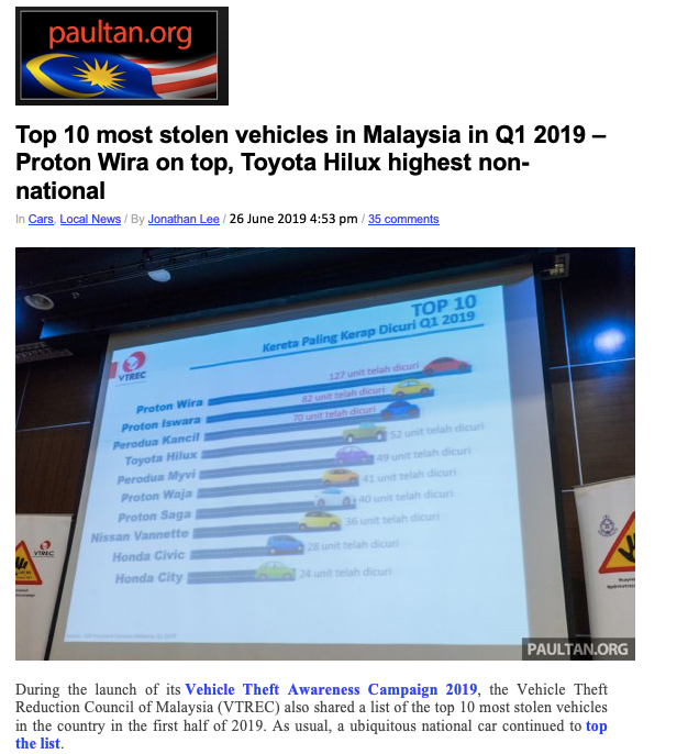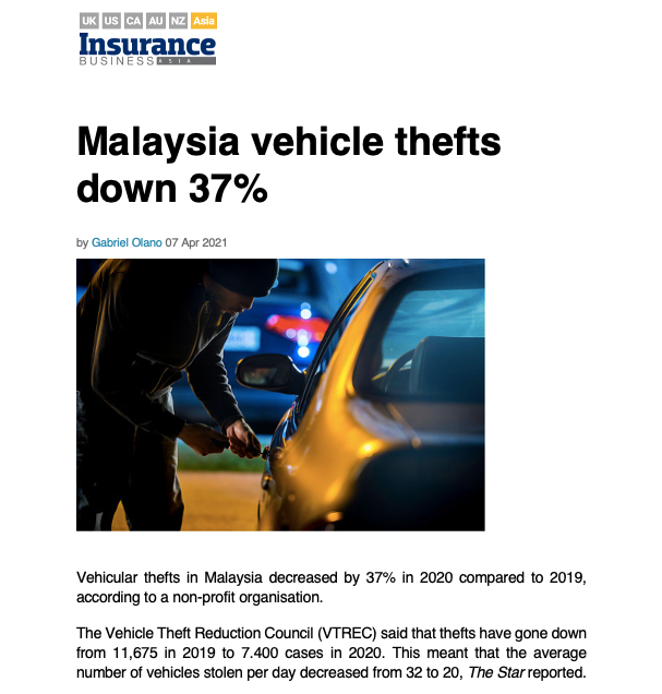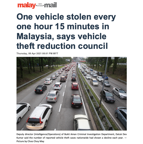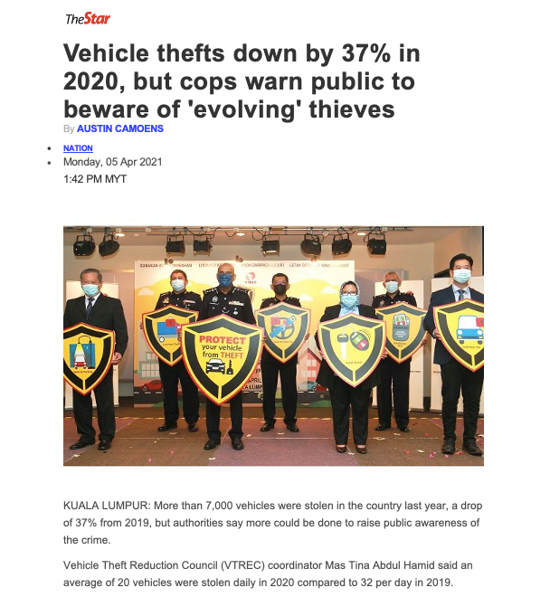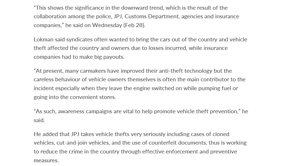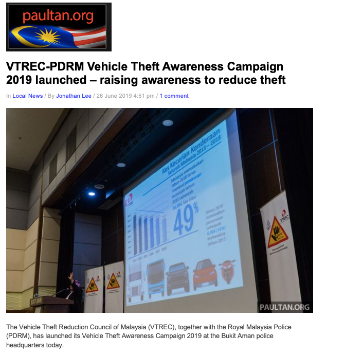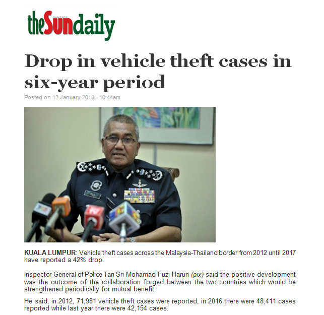 - “The different views of crime” – Malaysian car theft reduced by 20%
