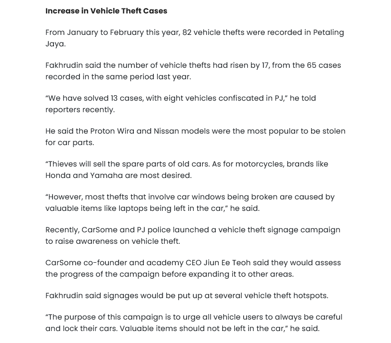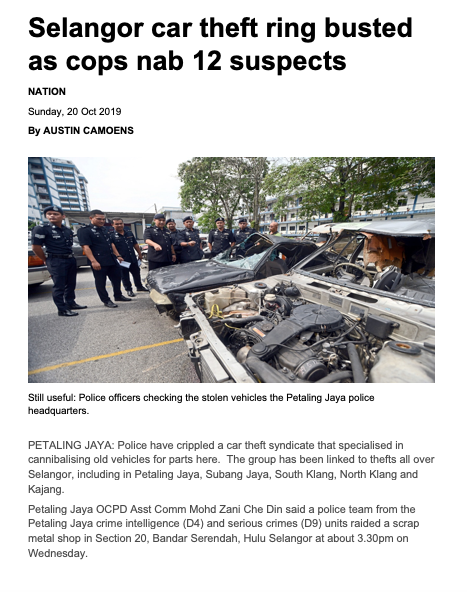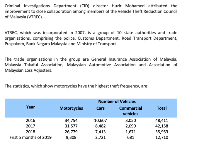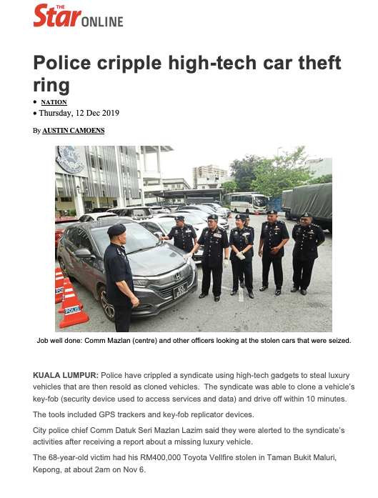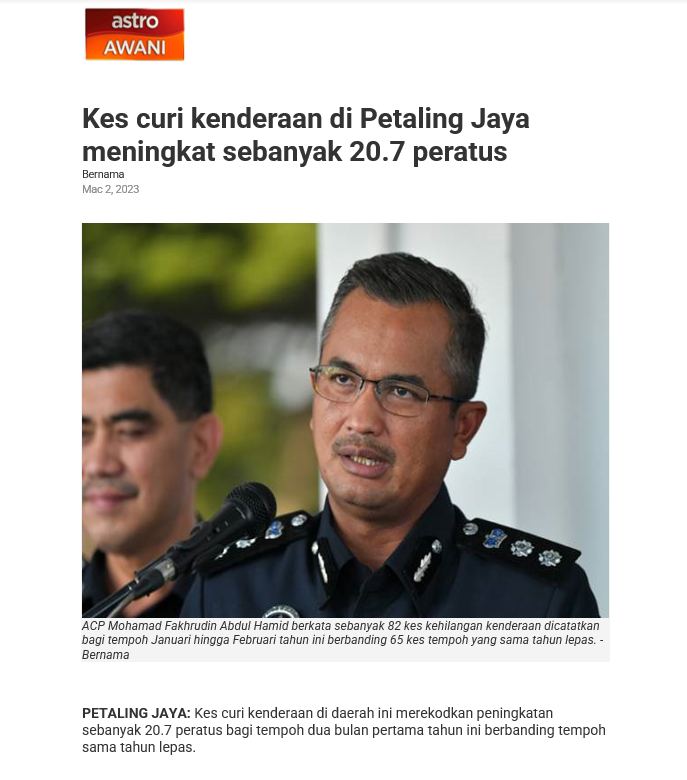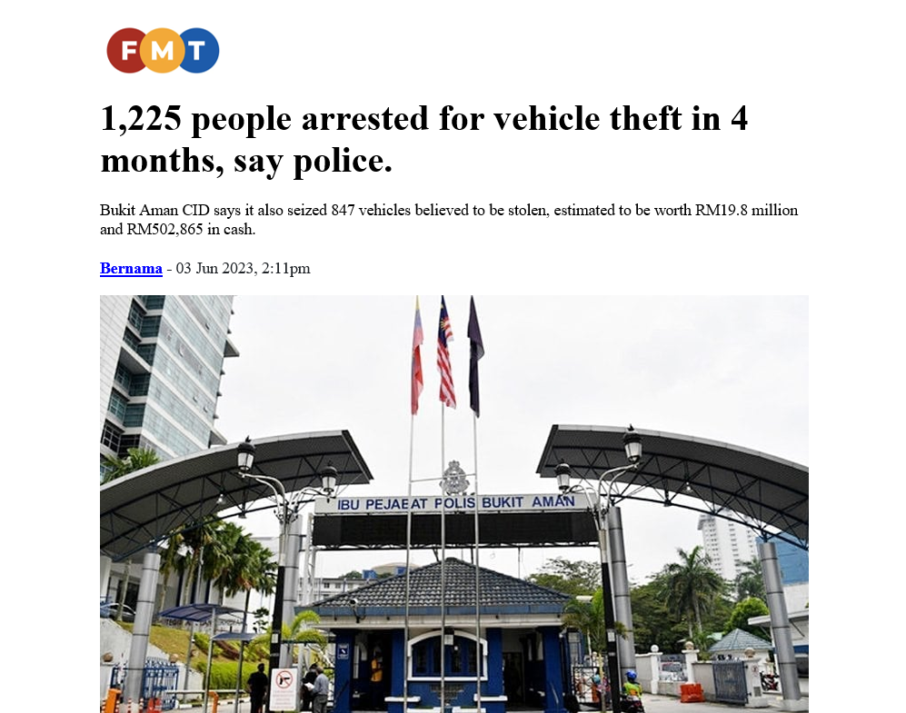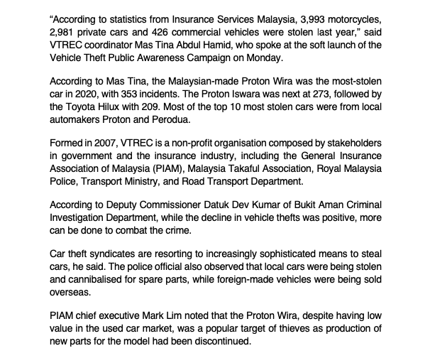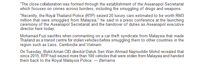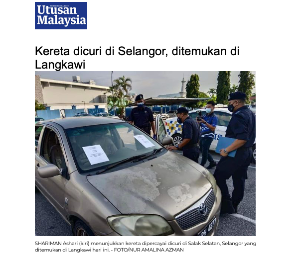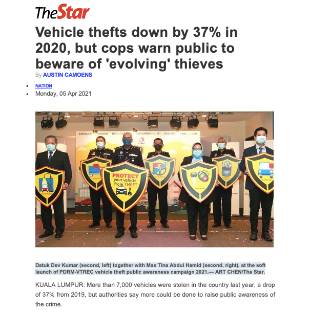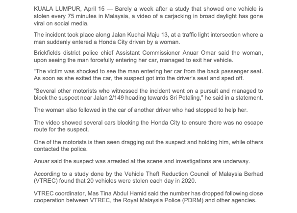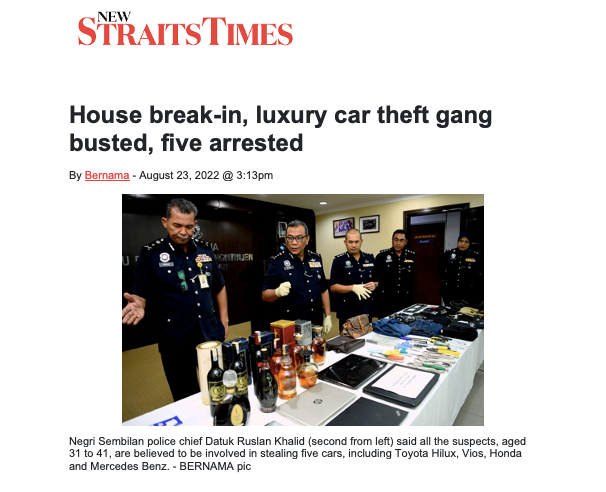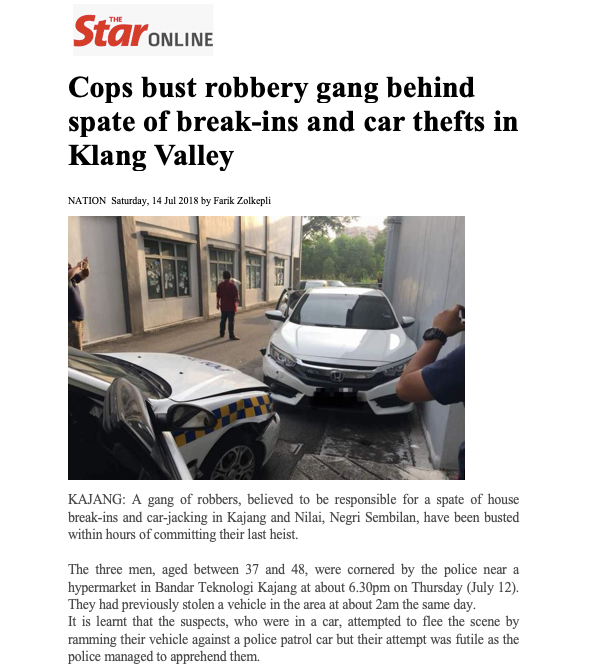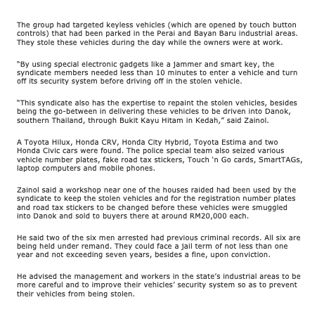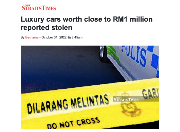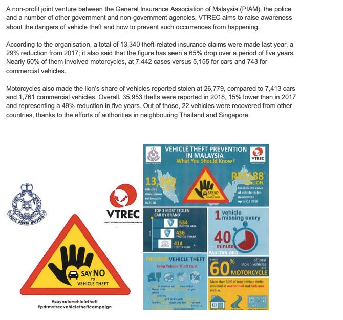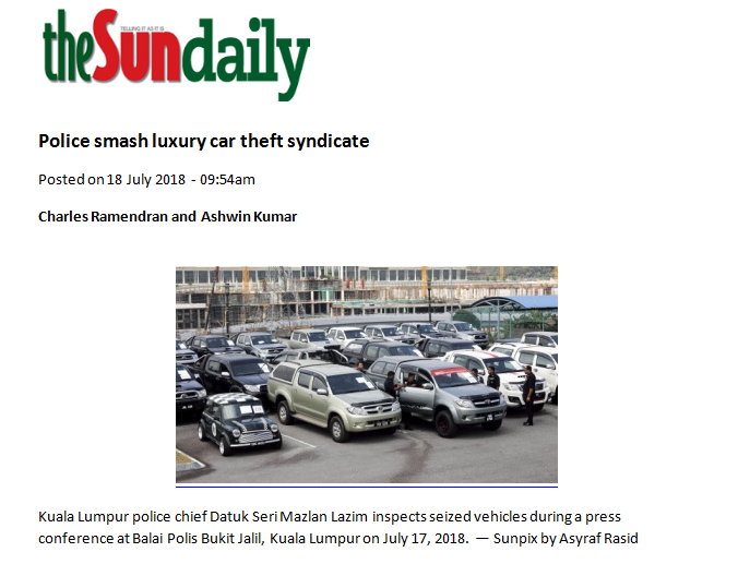- “The different views of crime” – Malaysian car theft reduced by 20%