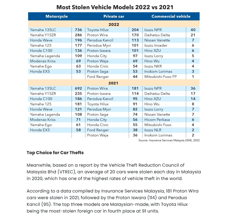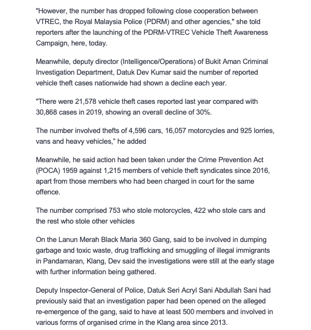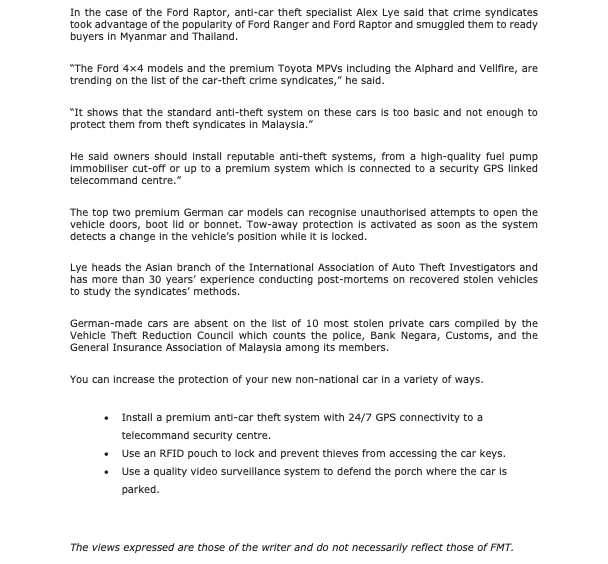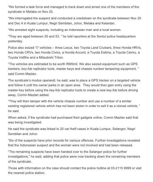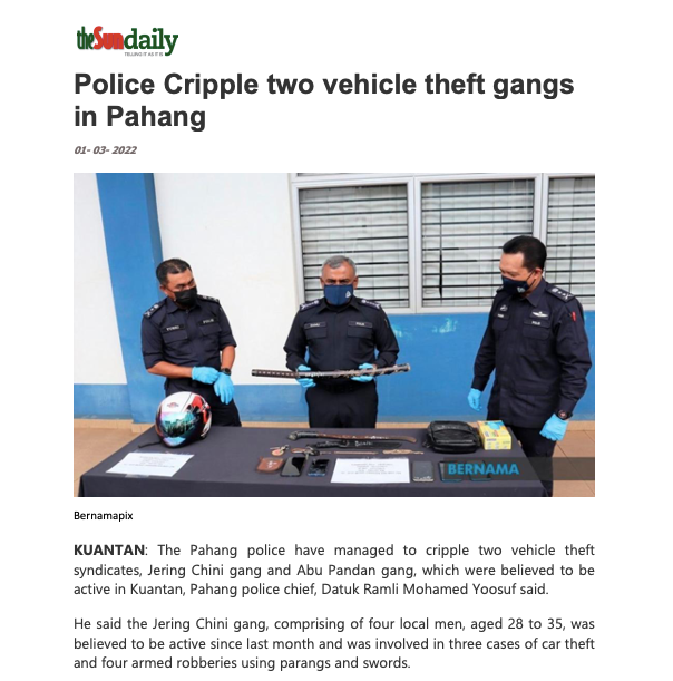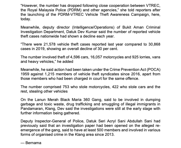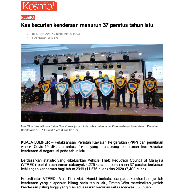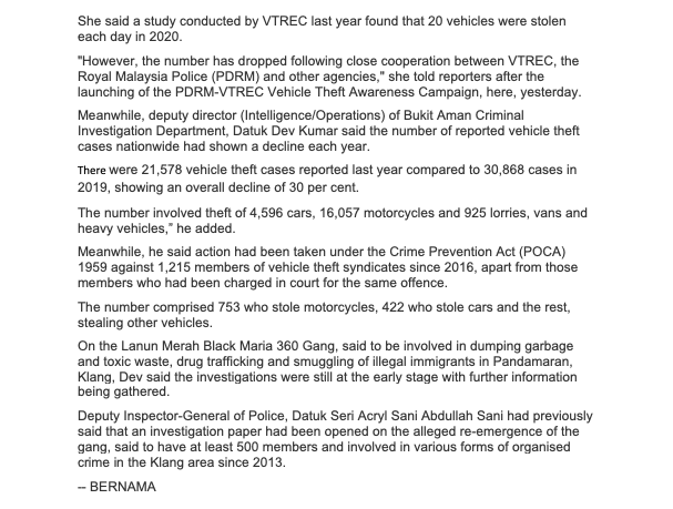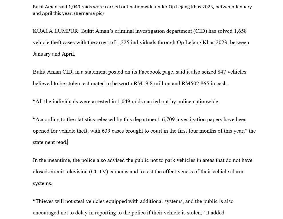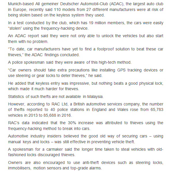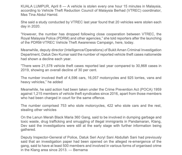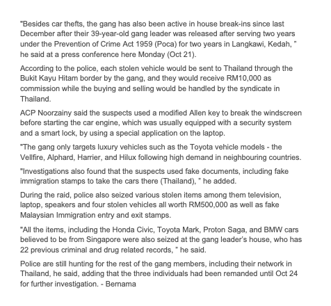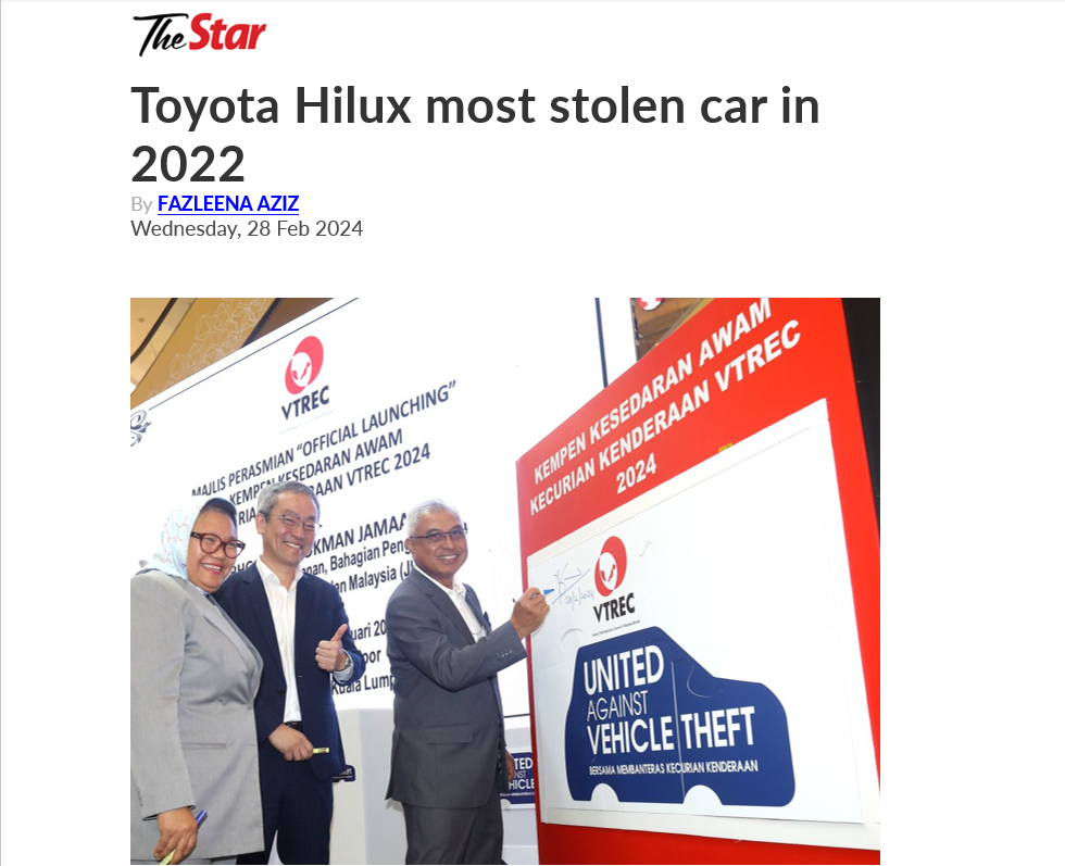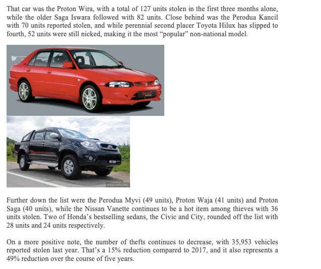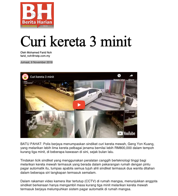 - “The different views of crime” – Malaysian car theft reduced by 20%