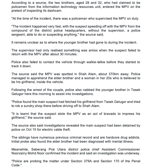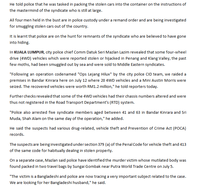 KUALA LUMPUR: A stolen car driven by a policeman uncovered a can of worms when five personnel attached to the federal CID and Special Branch were arrested for vehicle theft… (click paper cutting for more)