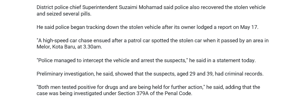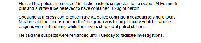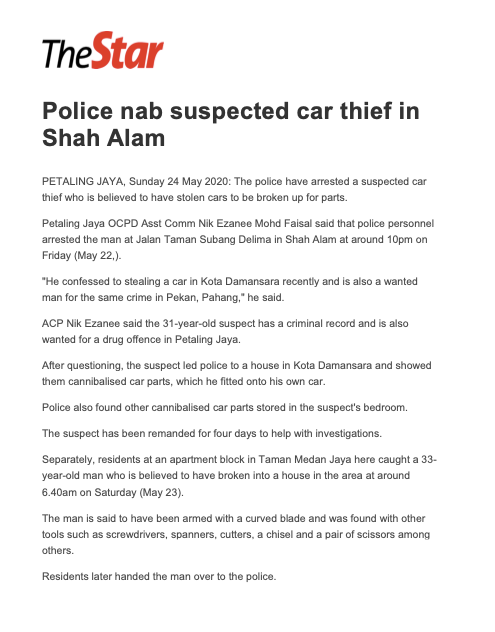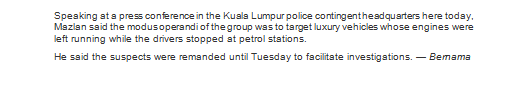 SHAH ALAM: An unemployed man, who is believed to be a member of a luxury car theft syndicate operating in the Klang Valley, was detained by police… (click paper cutting for more)