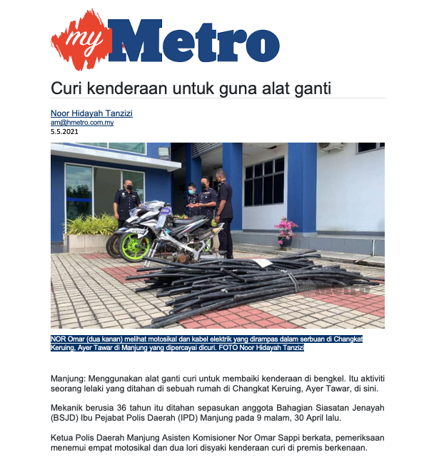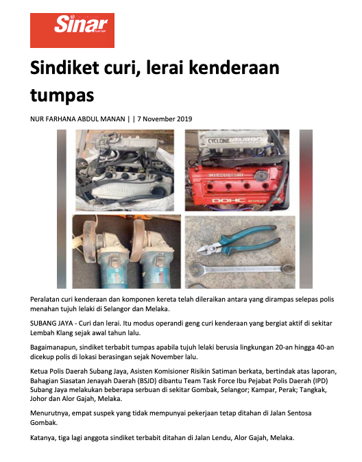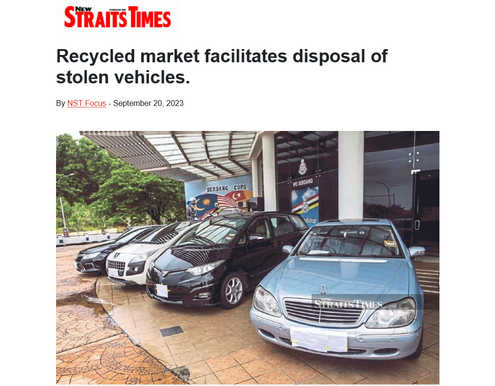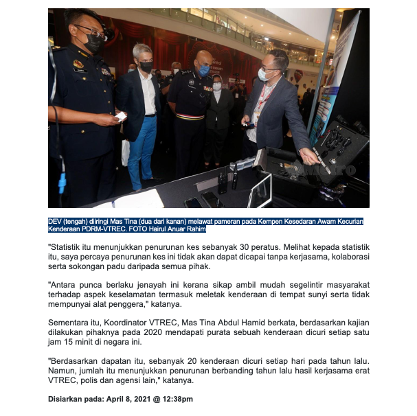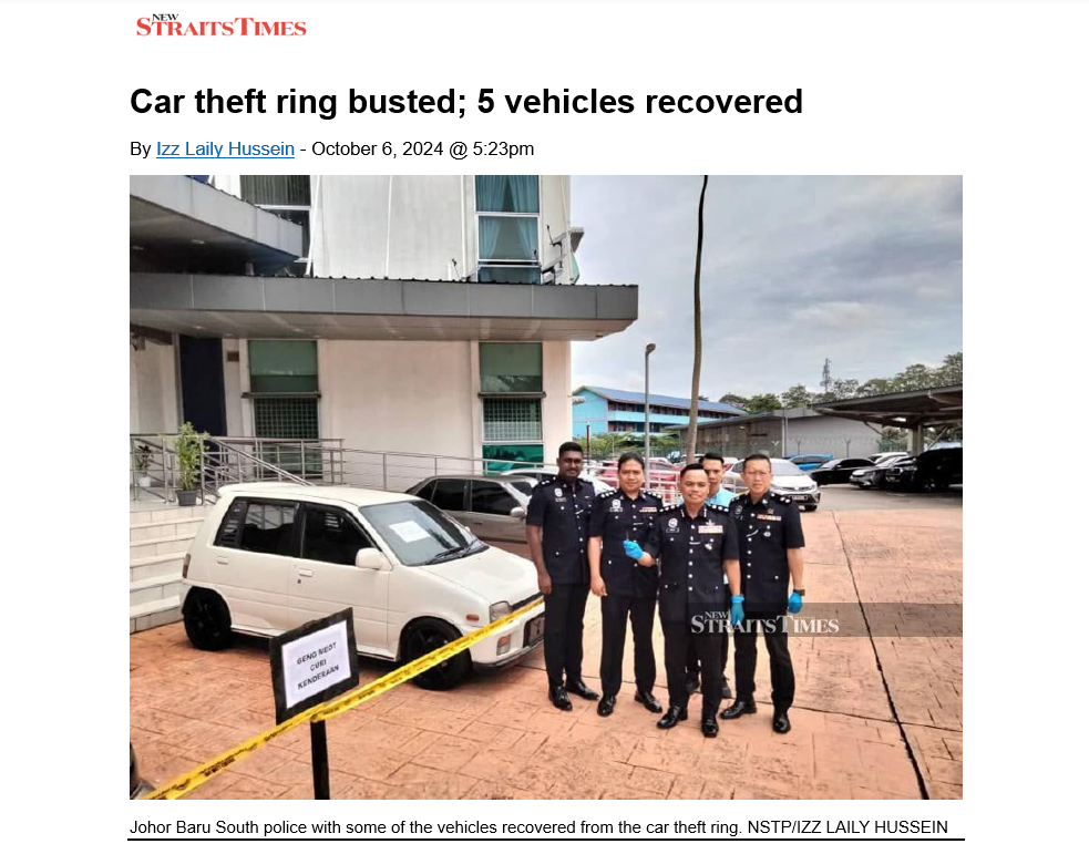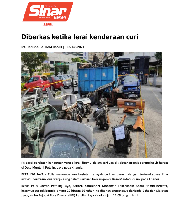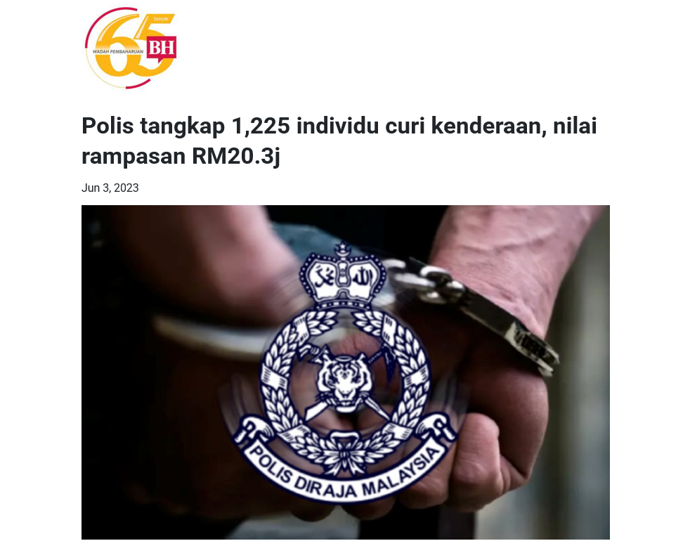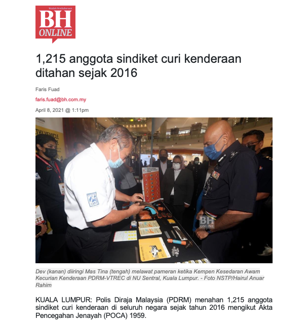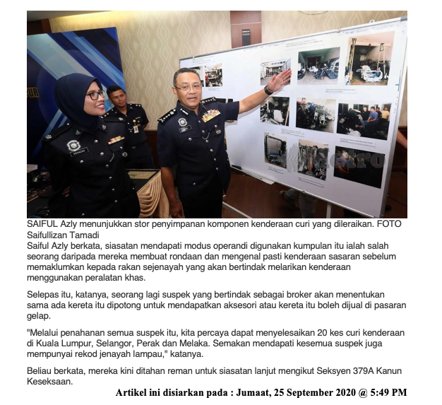 KUALA LUMPUR – 13 Oktober. Polis Diraja Malaysia (PDRM) telah berjaya menurunkan kes curi kenderaan dan kejayaan tersebut dicapai dengan menggunakan pelbagai strategi yang berkesan untuk mencegah kes curi kenderaan termasuk operasi antara agensi dan kerjasama dengan pihak berkepentingan yang lain…” (click paper cutting for more)