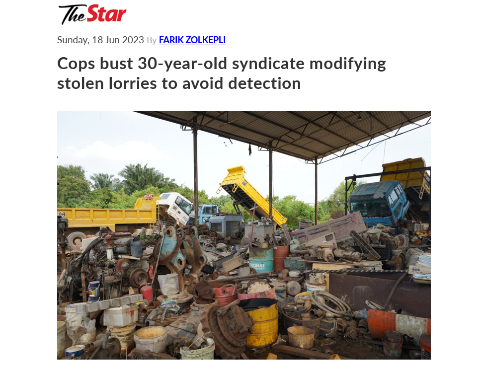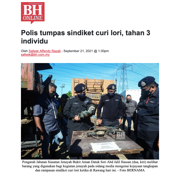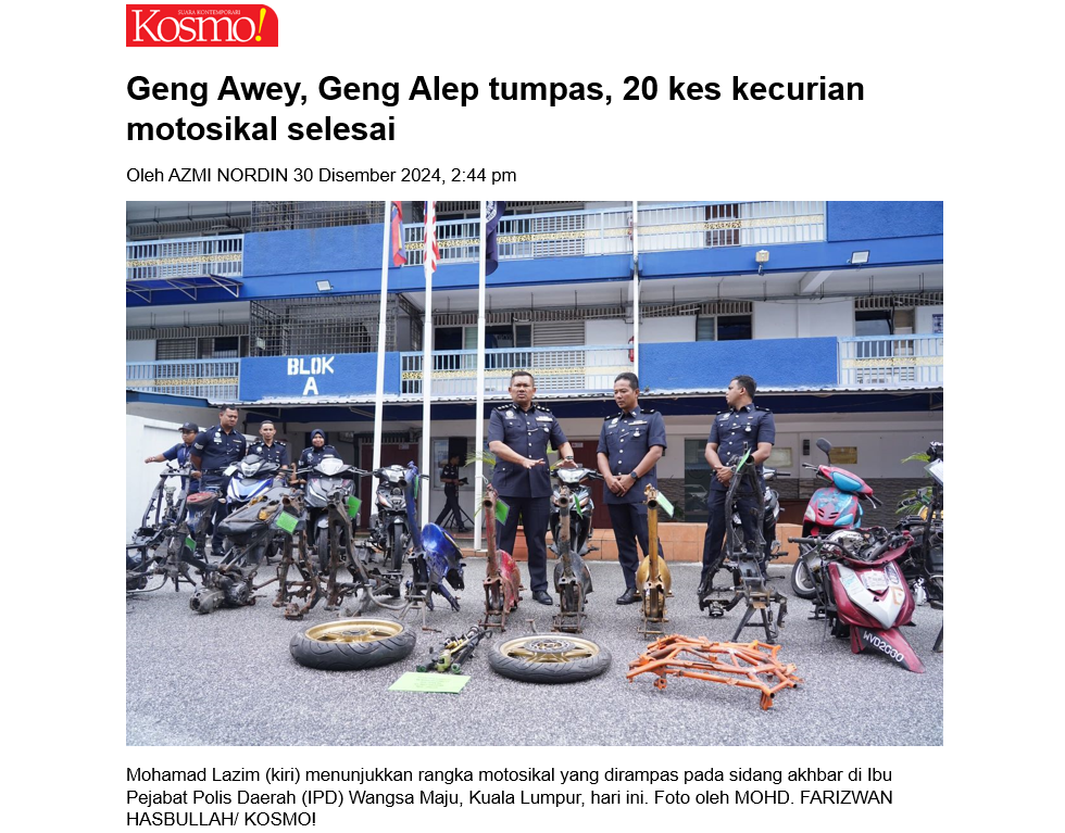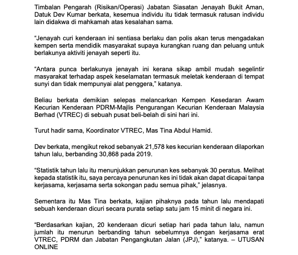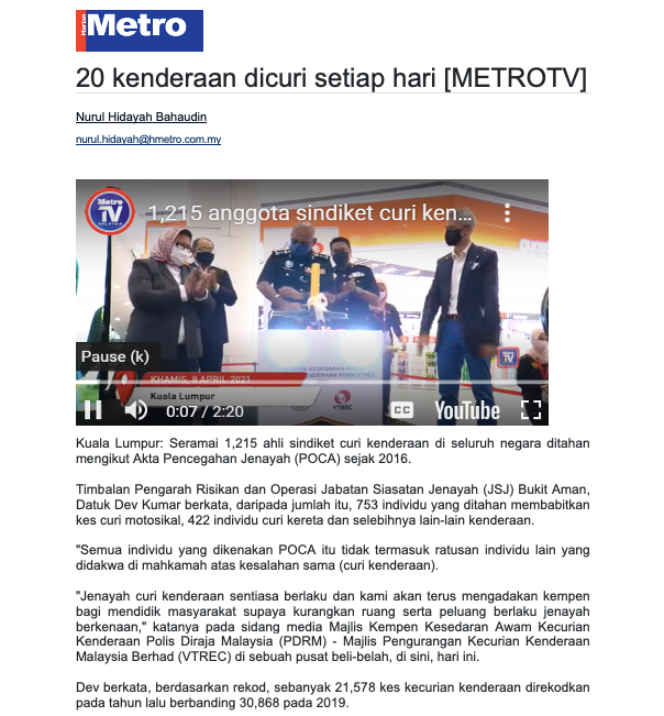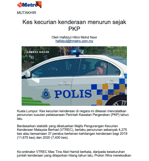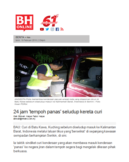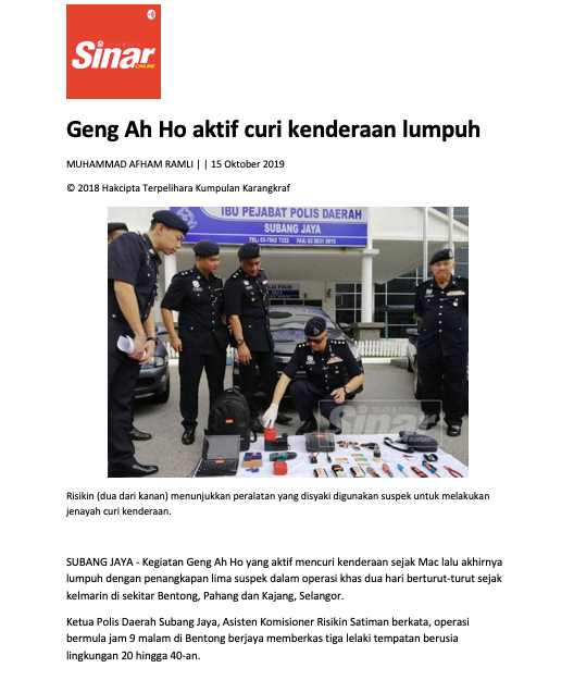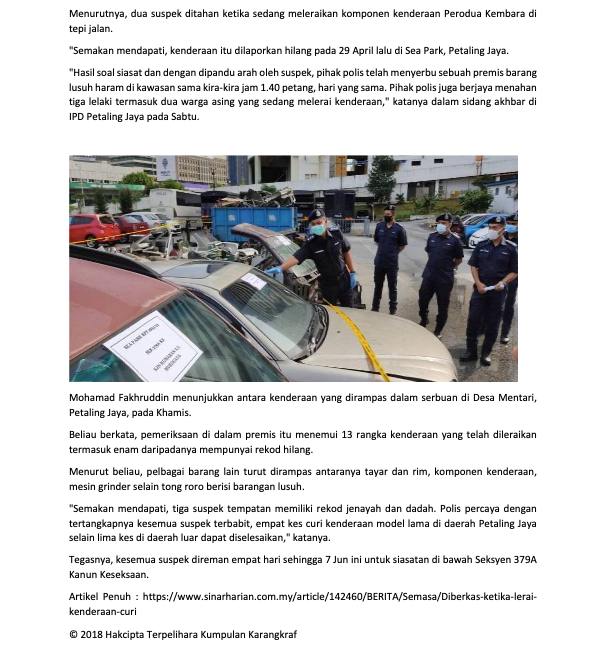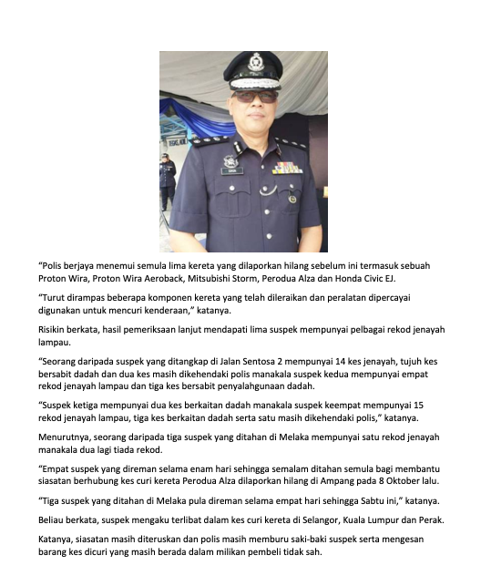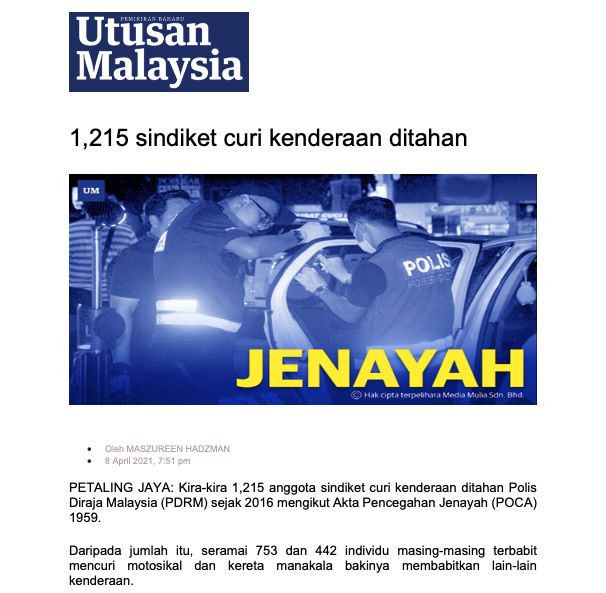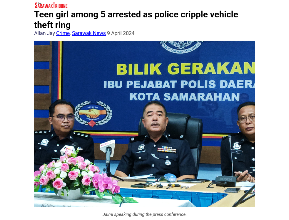KUALA LUMPUR – 13 Oktober. Polis Diraja Malaysia (PDRM) telah berjaya menurunkan kes curi kenderaan dan kejayaan tersebut dicapai dengan menggunakan pelbagai strategi yang berkesan untuk mencegah kes curi kenderaan termasuk operasi antara agensi dan kerjasama dengan pihak berkepentingan yang lain…” (click paper cutting for more)