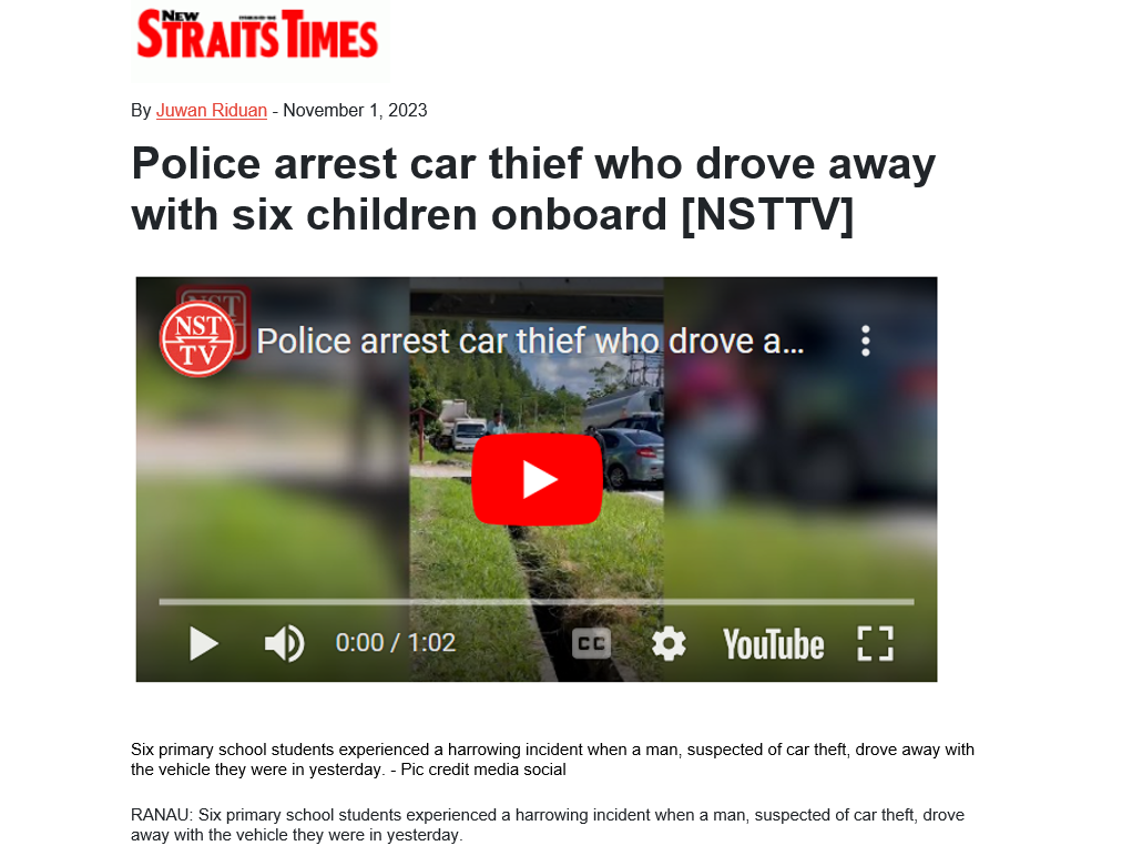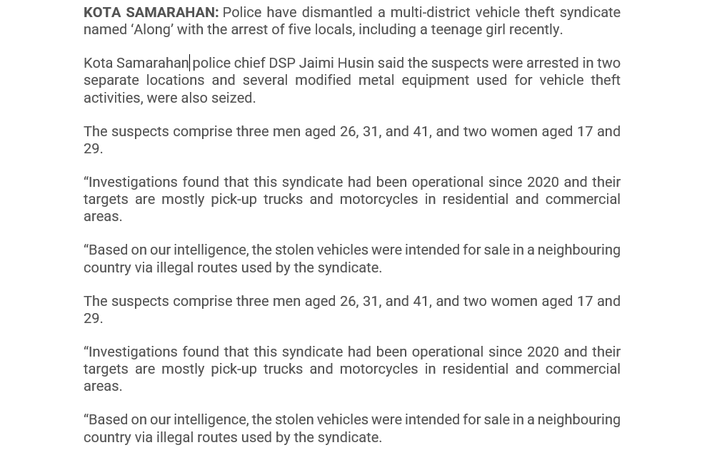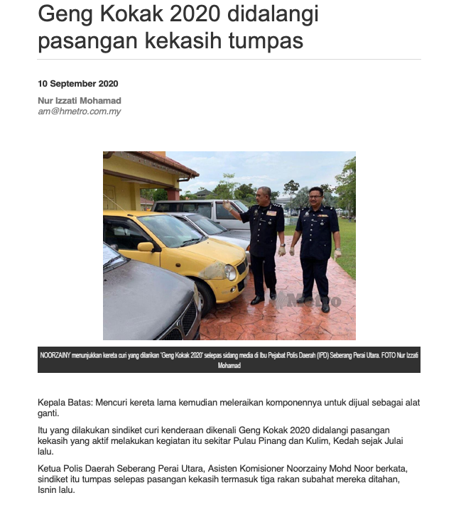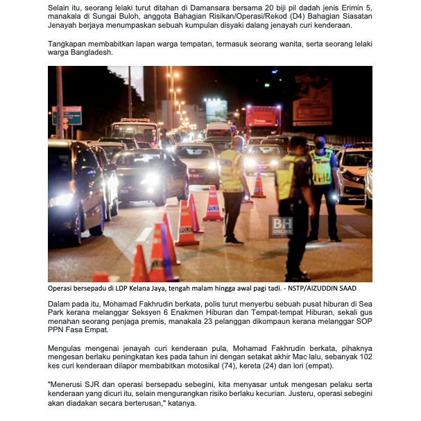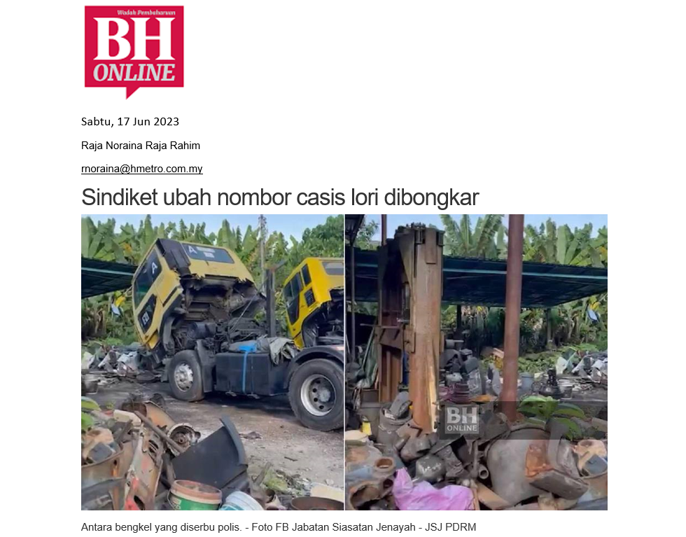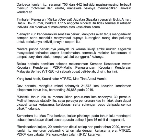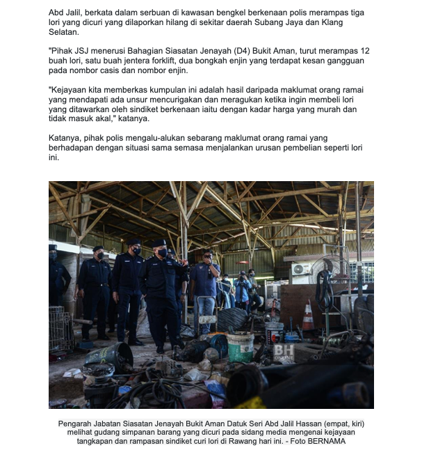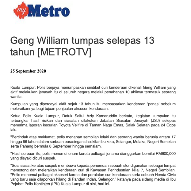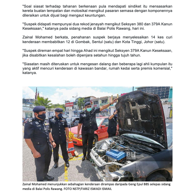 KUALA LUMPUR – 13 Oktober. Polis Diraja Malaysia (PDRM) telah berjaya menurunkan kes curi kenderaan dan kejayaan tersebut dicapai dengan menggunakan pelbagai strategi yang berkesan untuk mencegah kes curi kenderaan termasuk operasi antara agensi dan kerjasama dengan pihak berkepentingan yang lain…” (click paper cutting for more)