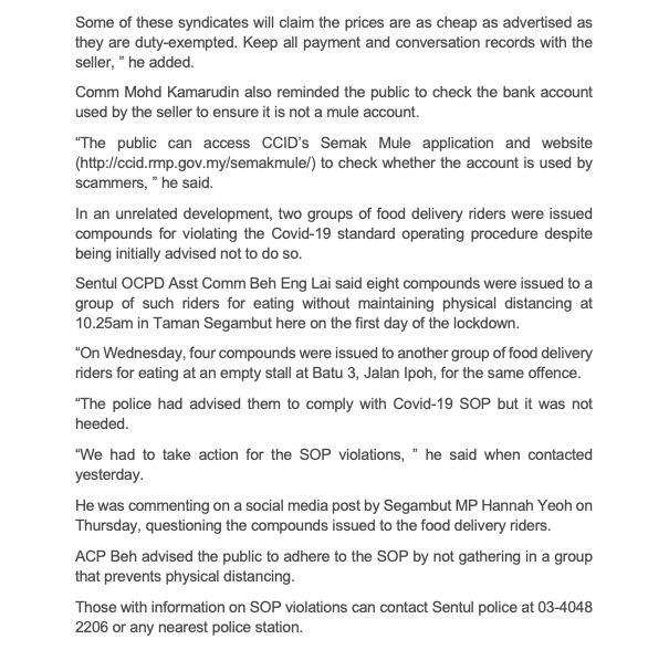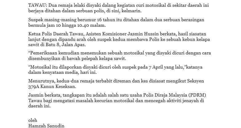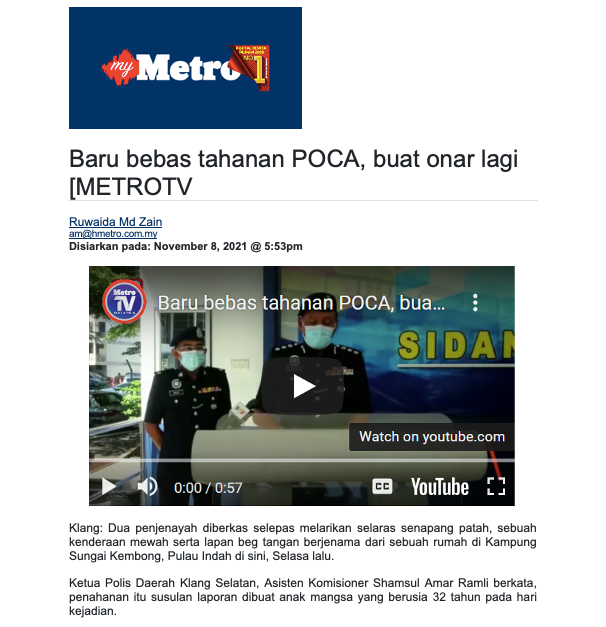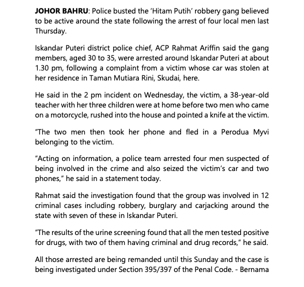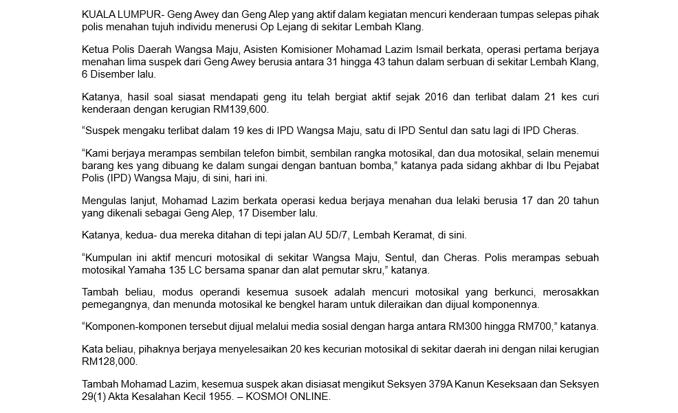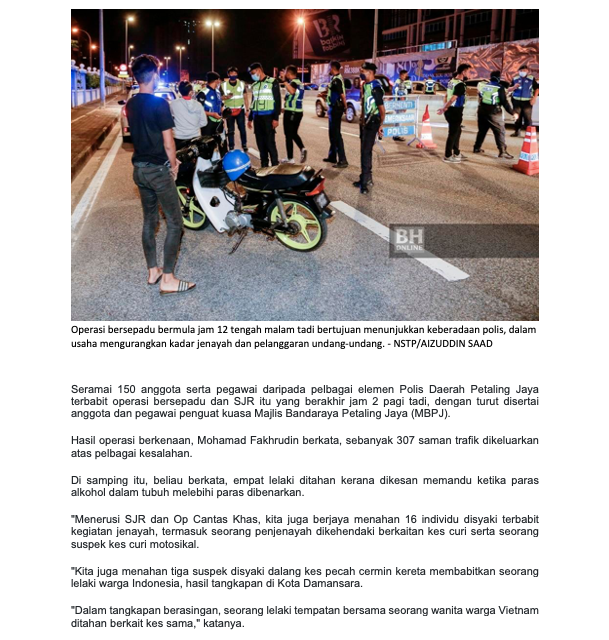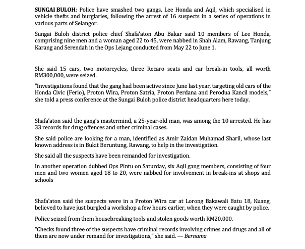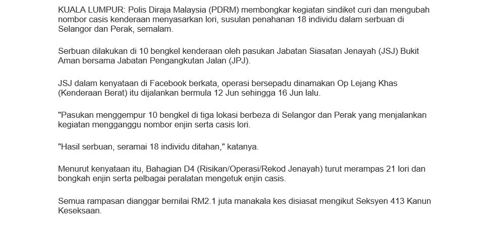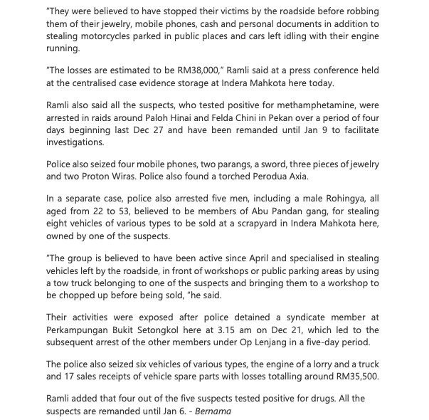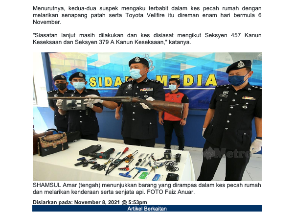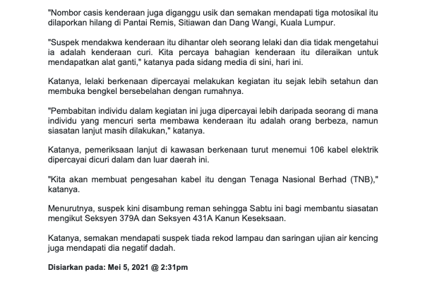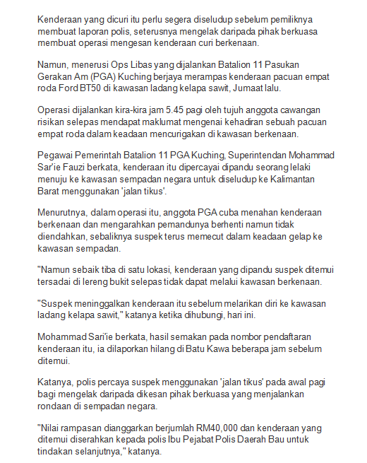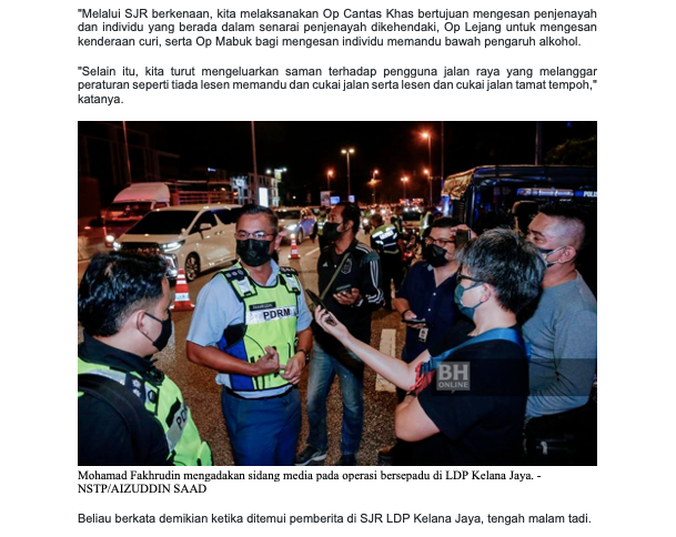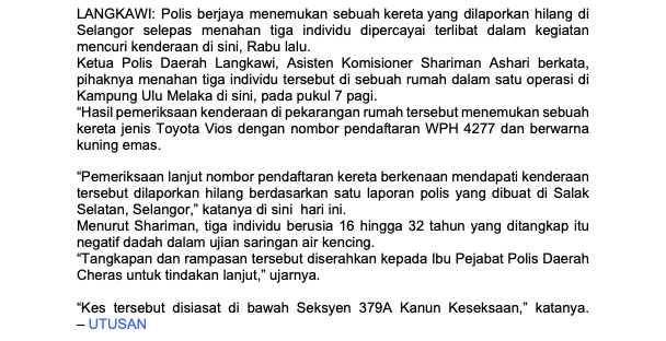 KUALA LUMPUR – 13 Oktober. Polis Diraja Malaysia (PDRM) telah berjaya menurunkan kes curi kenderaan dan kejayaan tersebut dicapai dengan menggunakan pelbagai strategi yang berkesan untuk mencegah kes curi kenderaan termasuk operasi antara agensi dan kerjasama dengan pihak berkepentingan yang lain…” (click paper cutting for more)