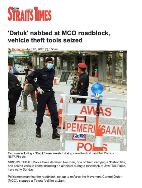 ‘Datuk’ nabbed at MCO roadblock, vehicle theft tools seized