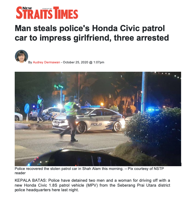 Man steals police’s Honda Civic patrol car to impress girlfriend, three arrested