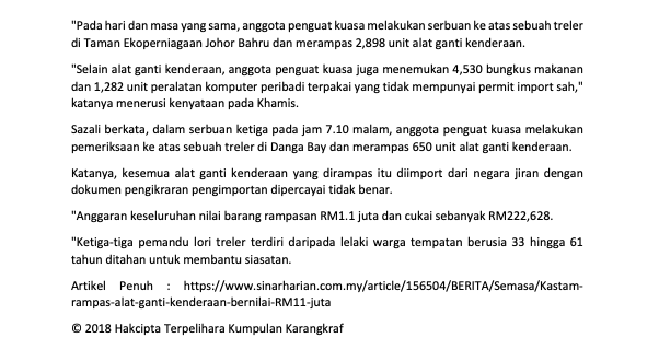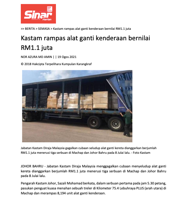 Kastam rampas alat ganti kenderaan bernilai RM 1.1 juta
