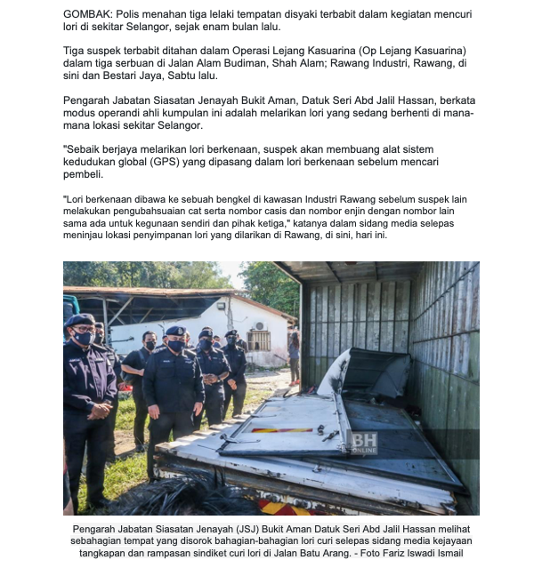 Polis tumpas sindiket curi lori, tahan 3 individu