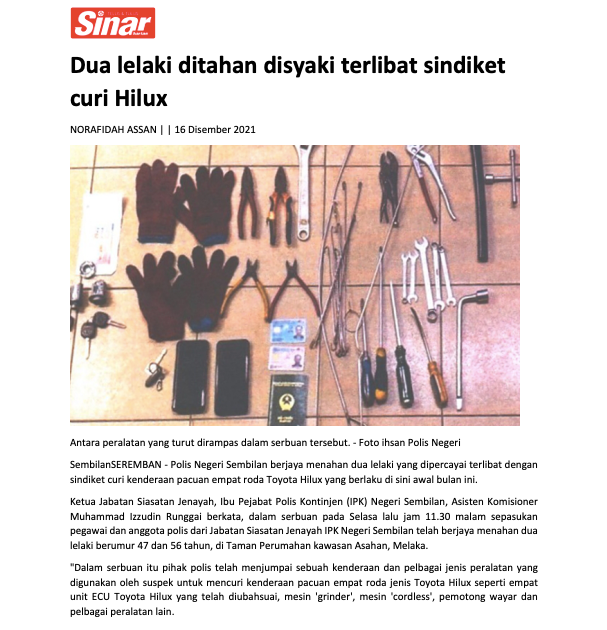 Dua lelaki ditahan disyaki terlibat sindiket curi Hilux