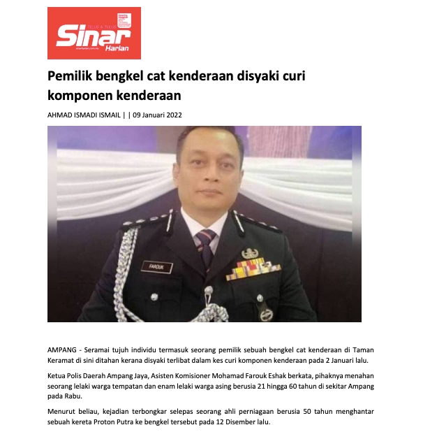 Pemilik bengkel cat kenderaan disyaki curi komponen kenderaan