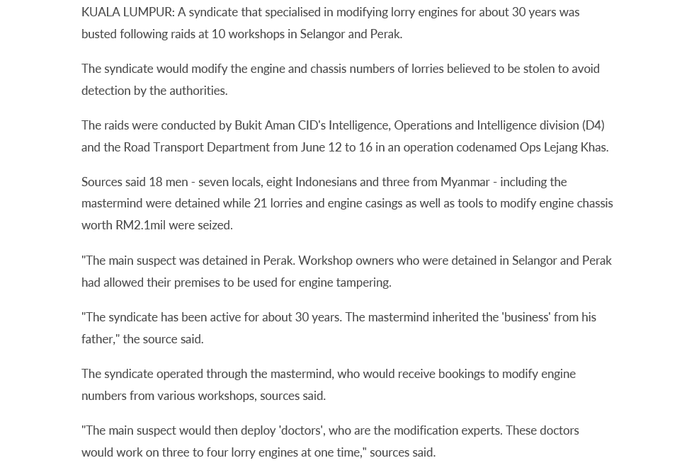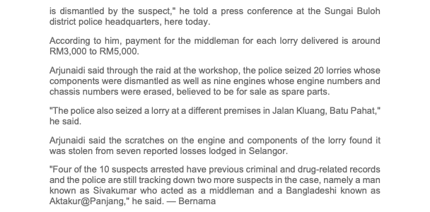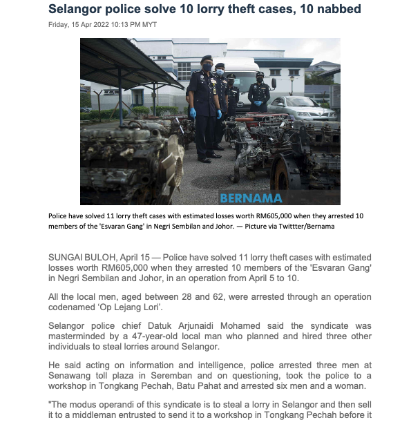 Selangor police solve 10 lorry theft cases, 10 nabbed